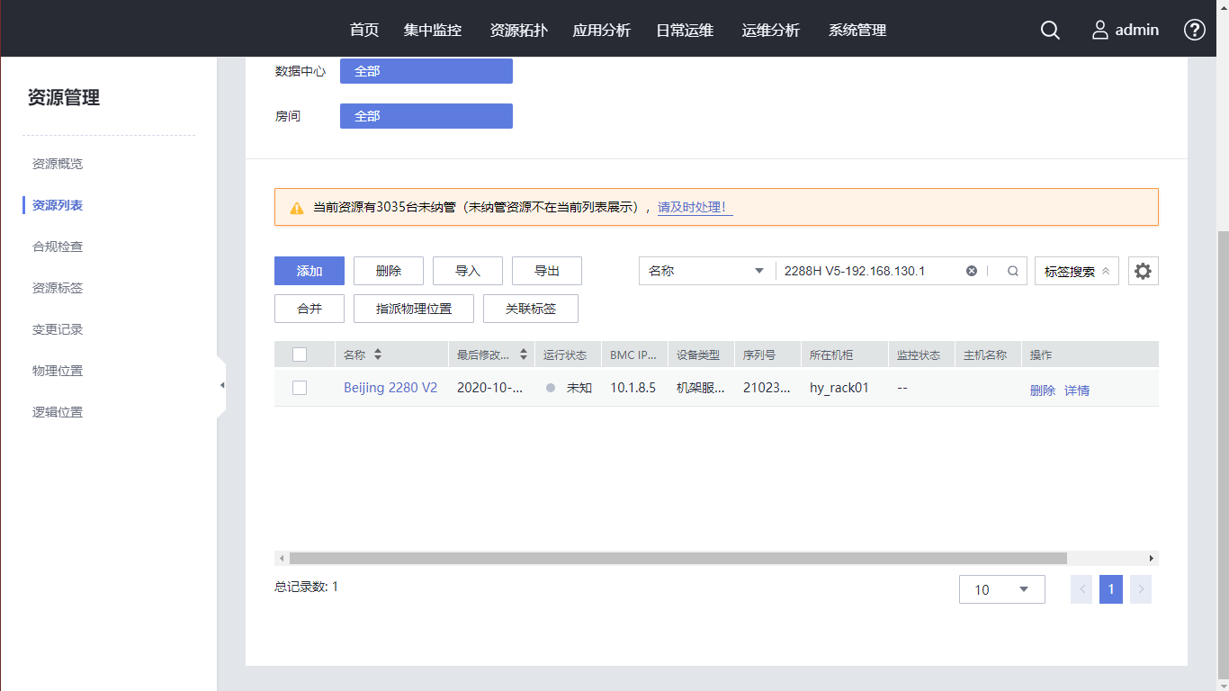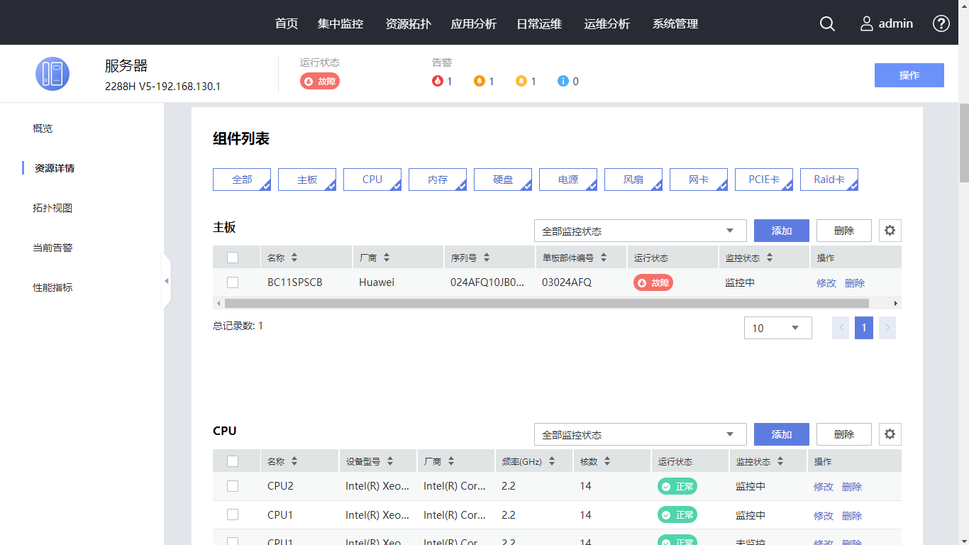 搜索名称为“2288H V5-192.168.130.1”的服务器,单击服务器名称的超链接,默认进入 “概览”页面。