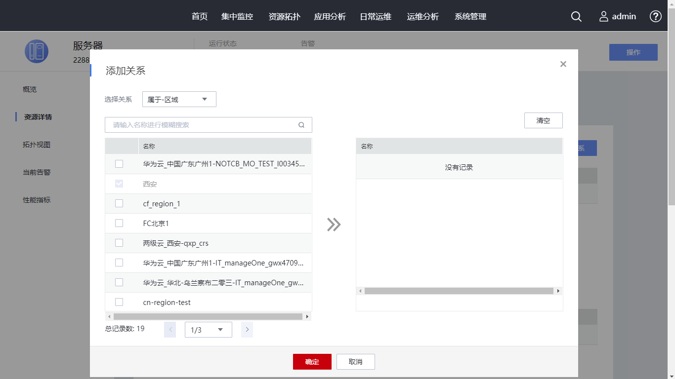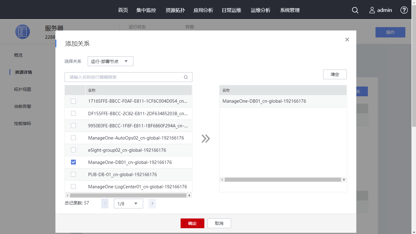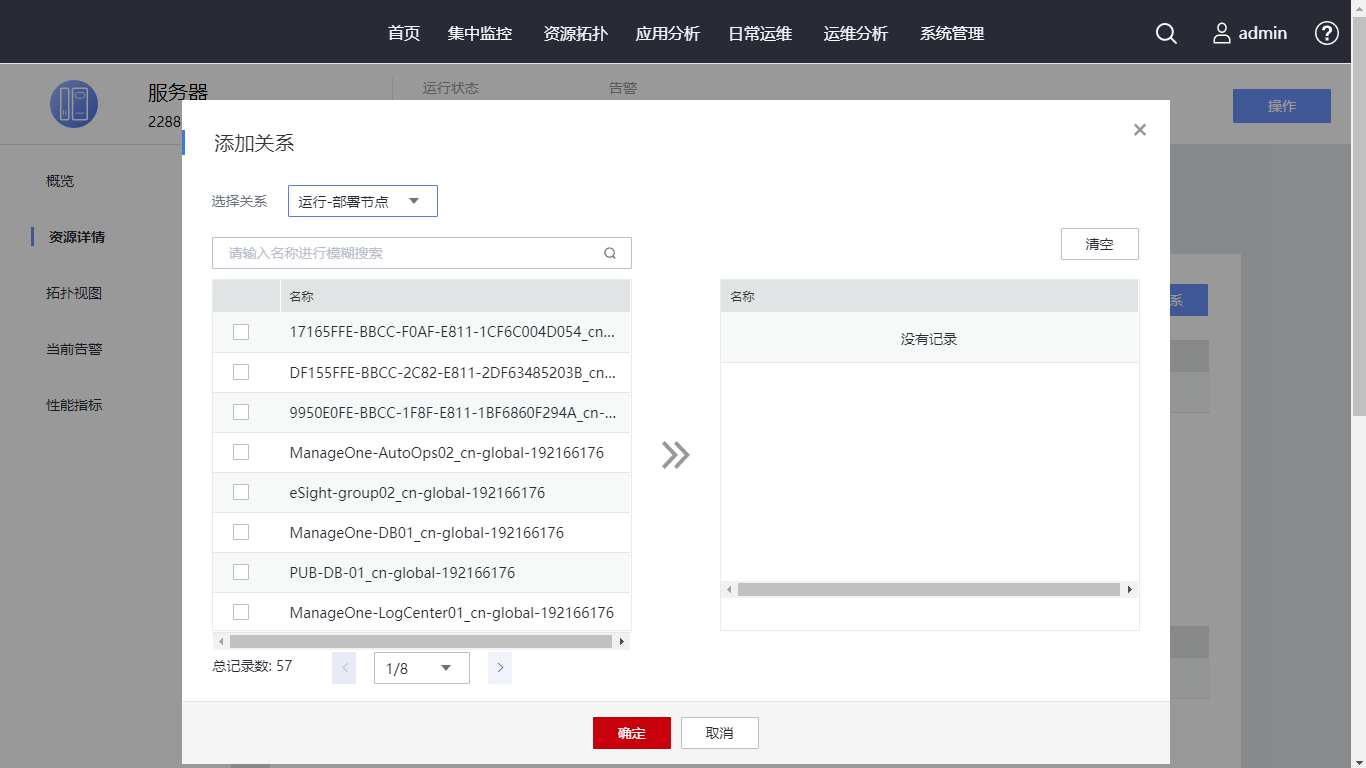 在资源关系页签,查看资源的关系信息。单击“添加关系”,弹出“添加关系”对话框,在选择关系下拉框选择“运行-部署节点”,勾选名称为“ManageOne-DB01_cn-global-192166176l”的关系,单击“确定”。查看已添加的资源关系。请您继续单击“变更记录”页签。