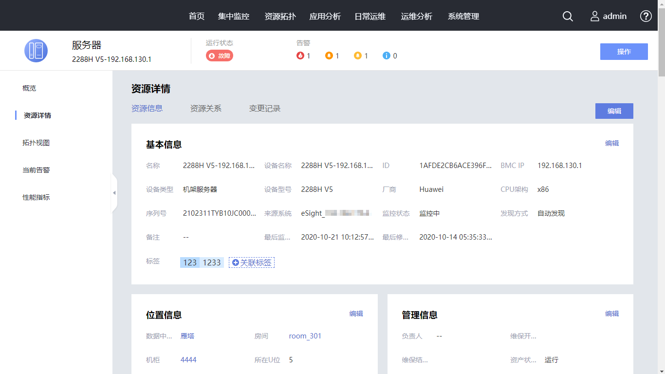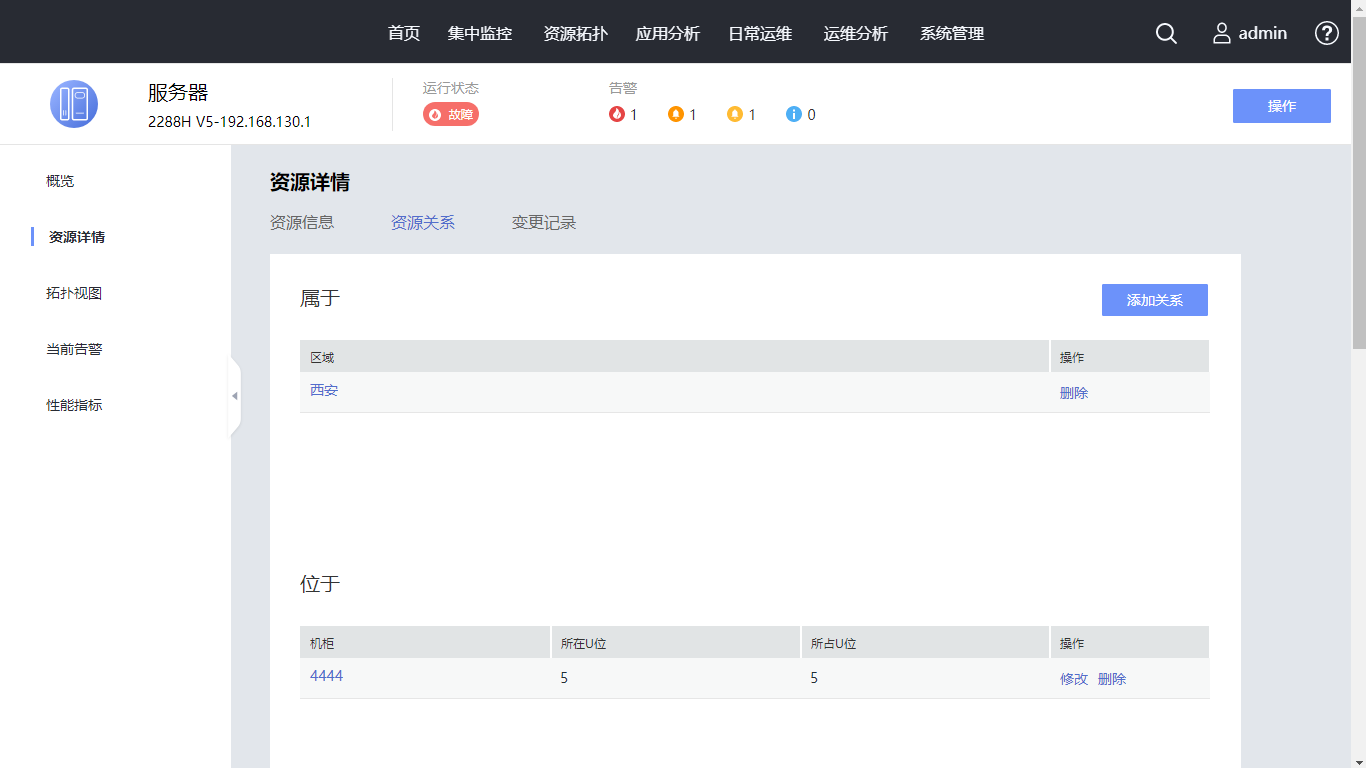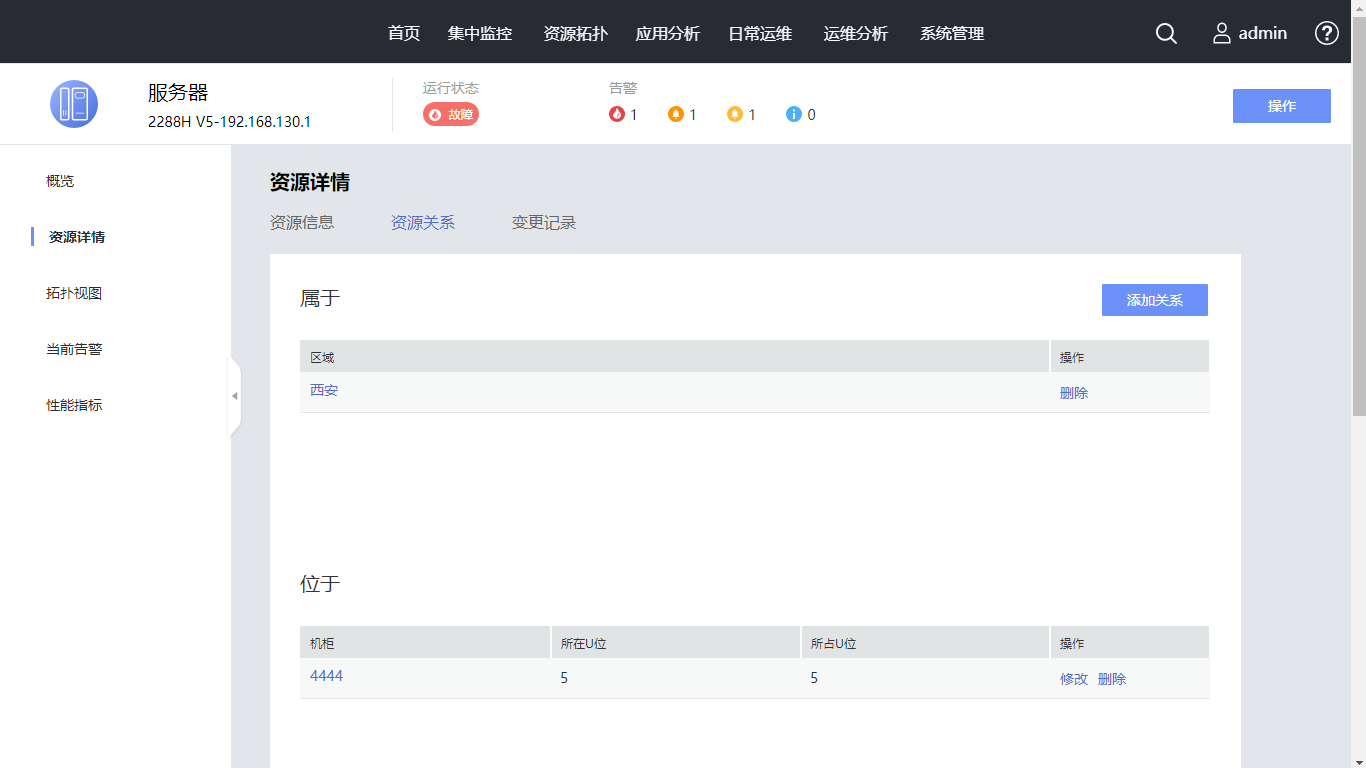 在资源详情页面,查看资源的基本信息、位置信息、管理信息、组件列表等。请您继续单击“资源关系”页签。