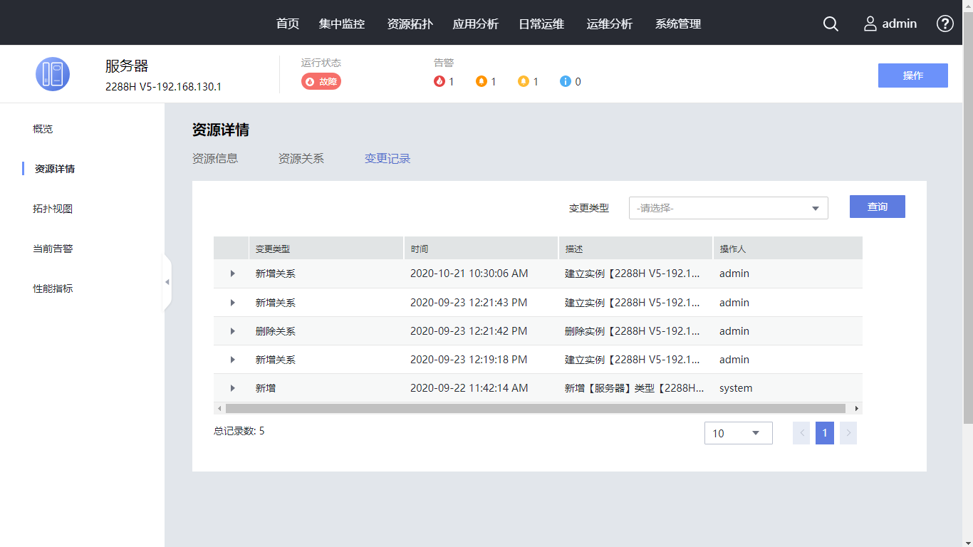在“变更记录”页签,查看资源的变更记录。请您继续单击左树“拓扑视图”。