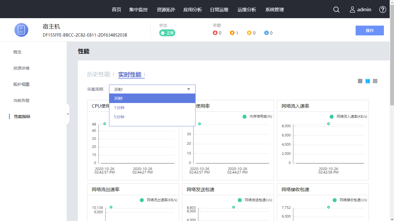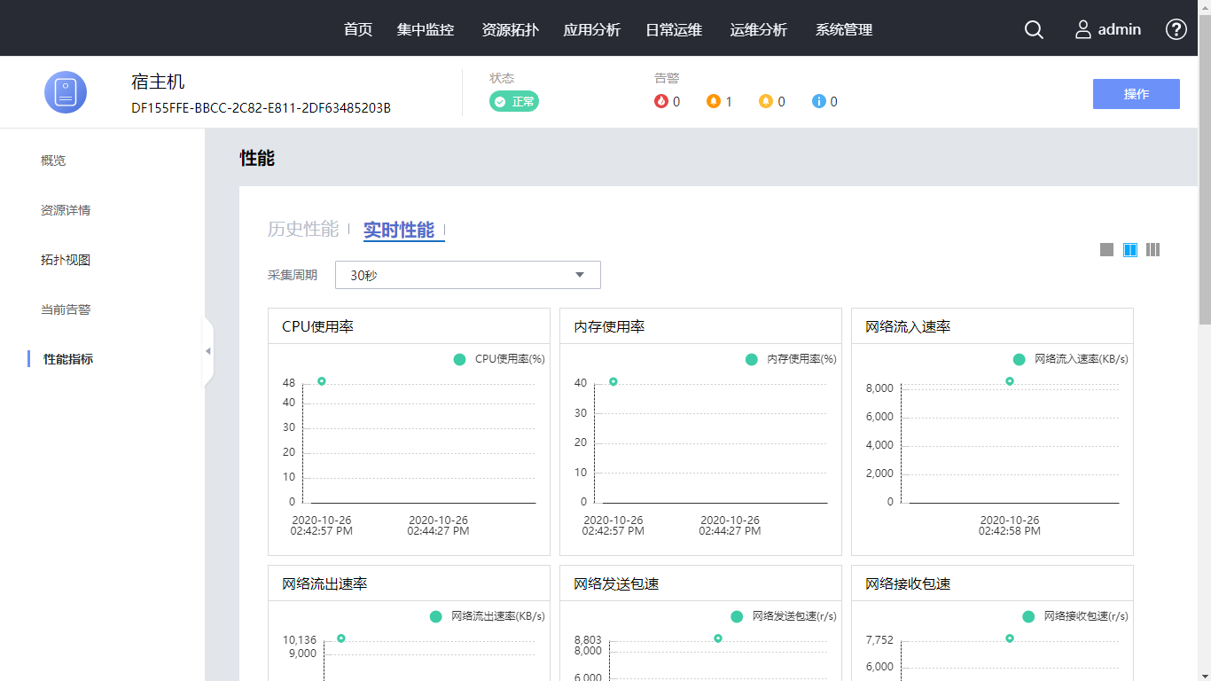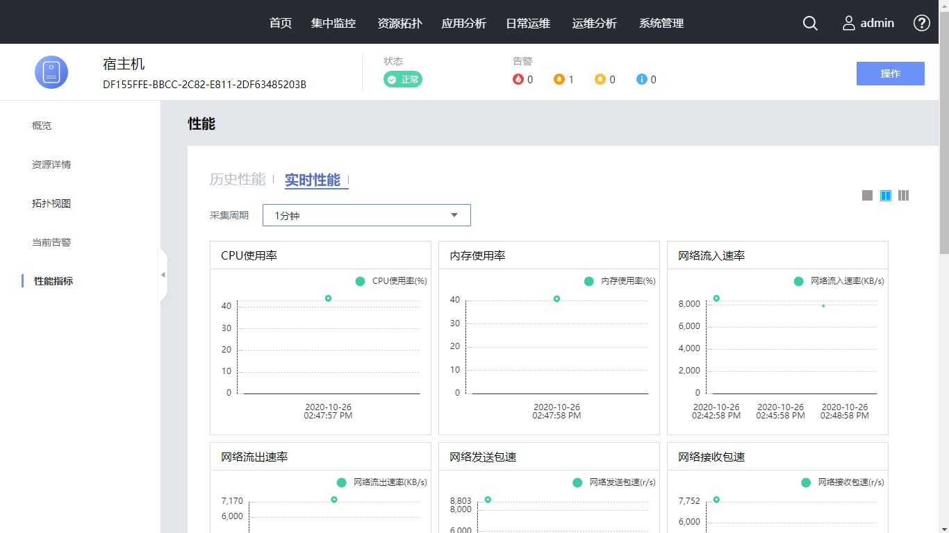 在左侧导航选择“性能指标”,可查看资源的性能信息。时间选择为“最近一天”,查看最近一天性能指标。单击页面右上角的布局图标,使性能数据不同排显示。单击“实时性能”,采集周期选择“1分钟”,查看实时性能指标。