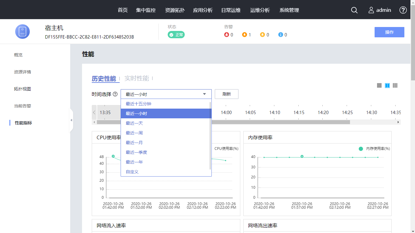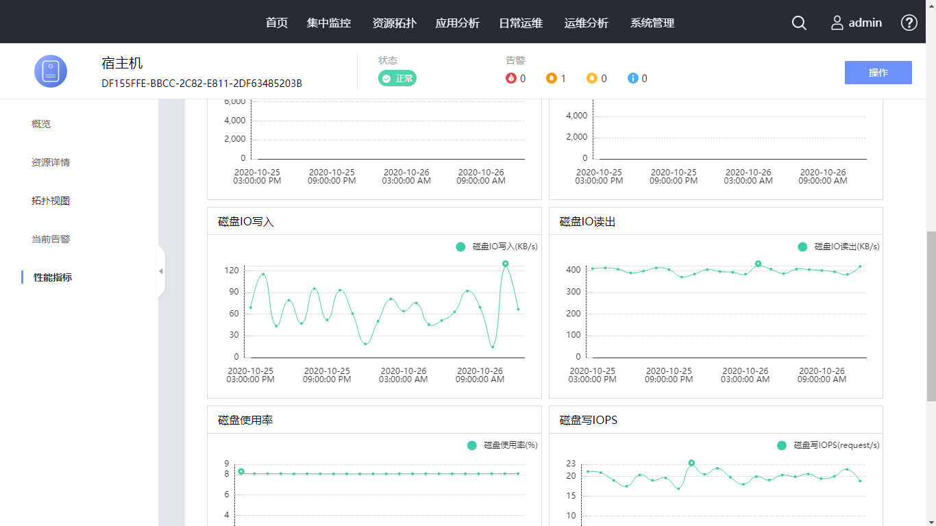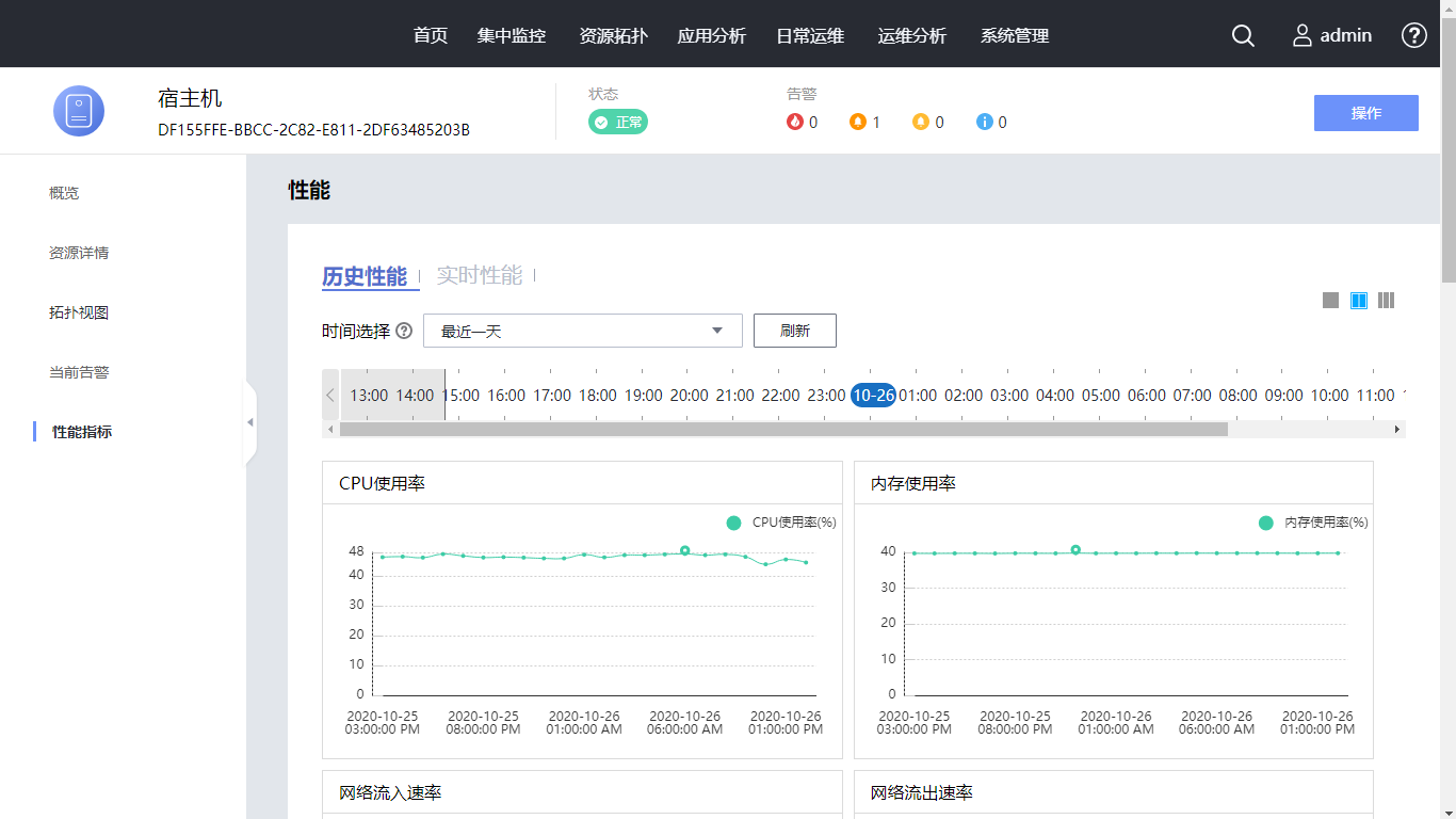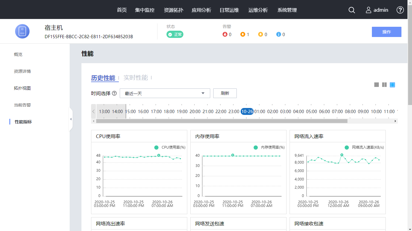 在左侧导航选择“性能指标”,可查看资源的性能信息。时间选择为“最近一天”,查看最近一天性能指标。单击页面右上角的布局图标,使性能数据不同排显示。单击“实时性能”,采集周期选择“1分钟”,查看实时性能指标。