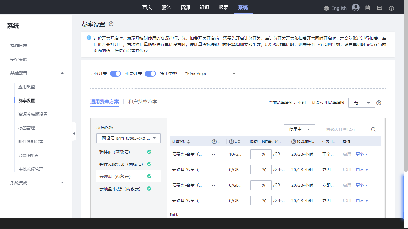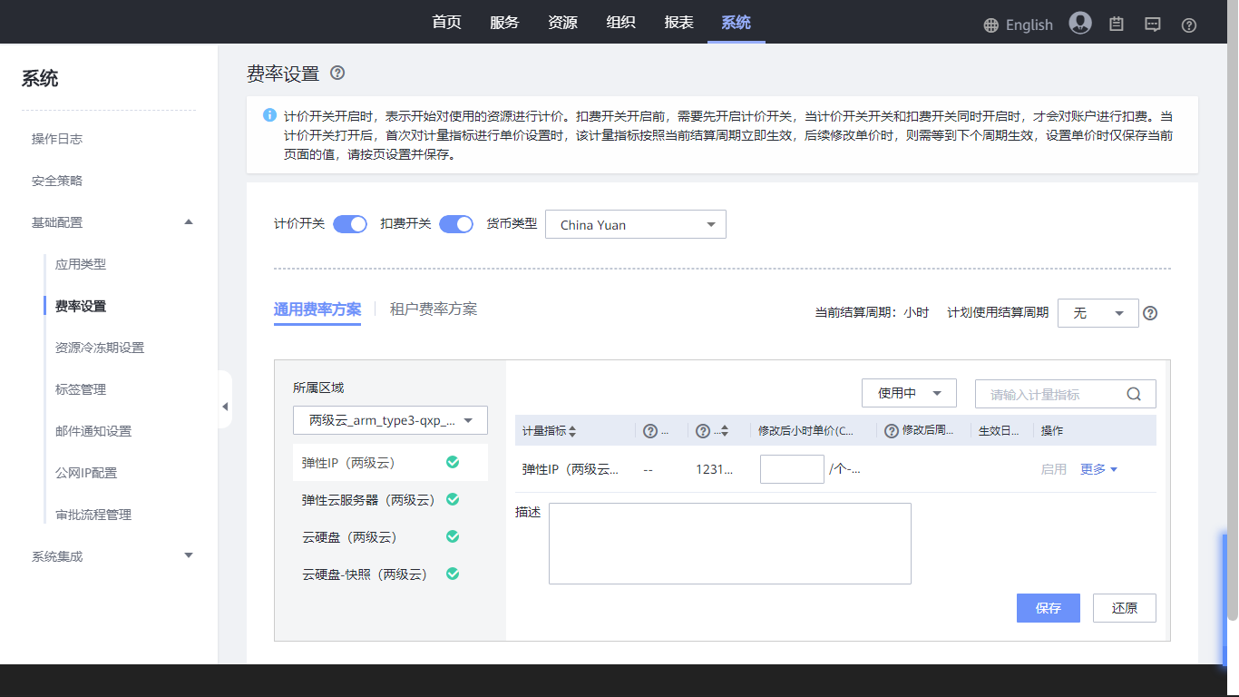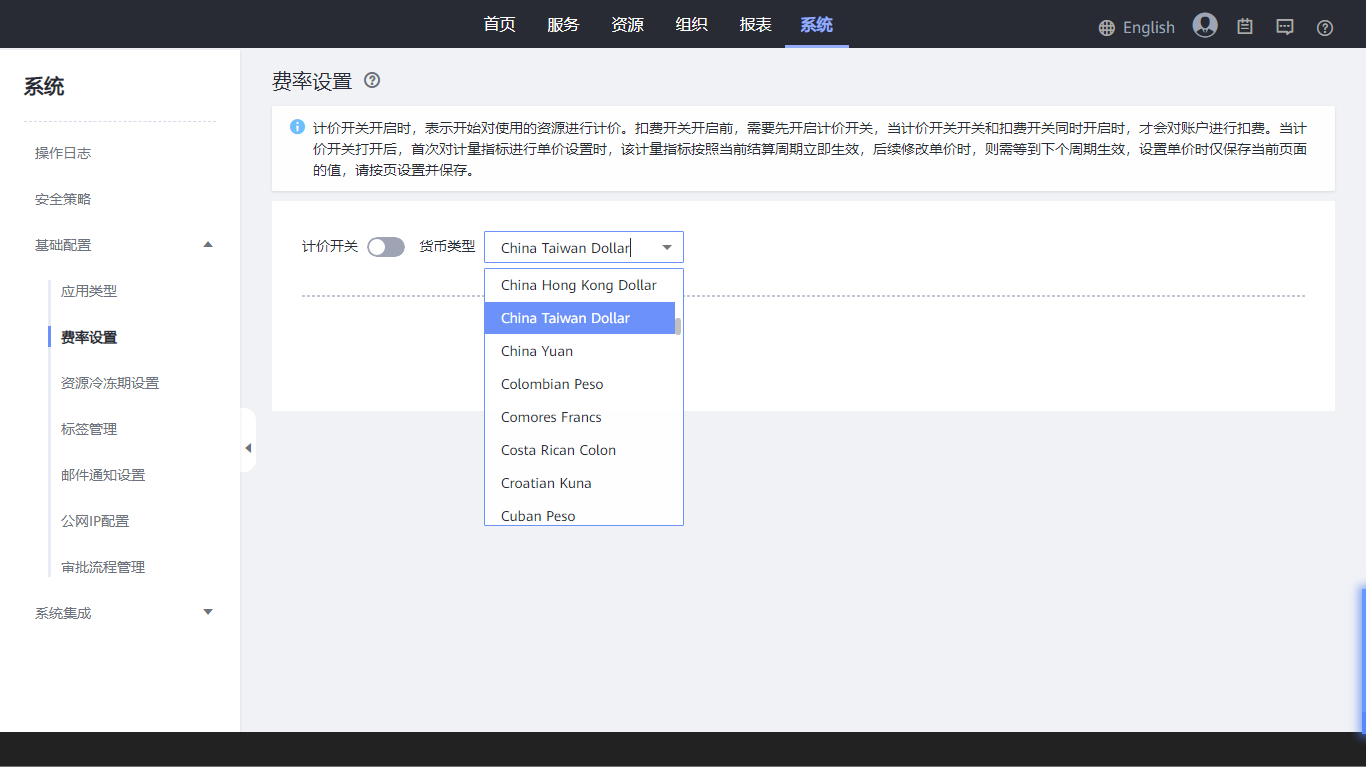 将货币类型设置为“China Yuan”,您也可以根据实际需要设置货币类型。打开计价和扣费开关。