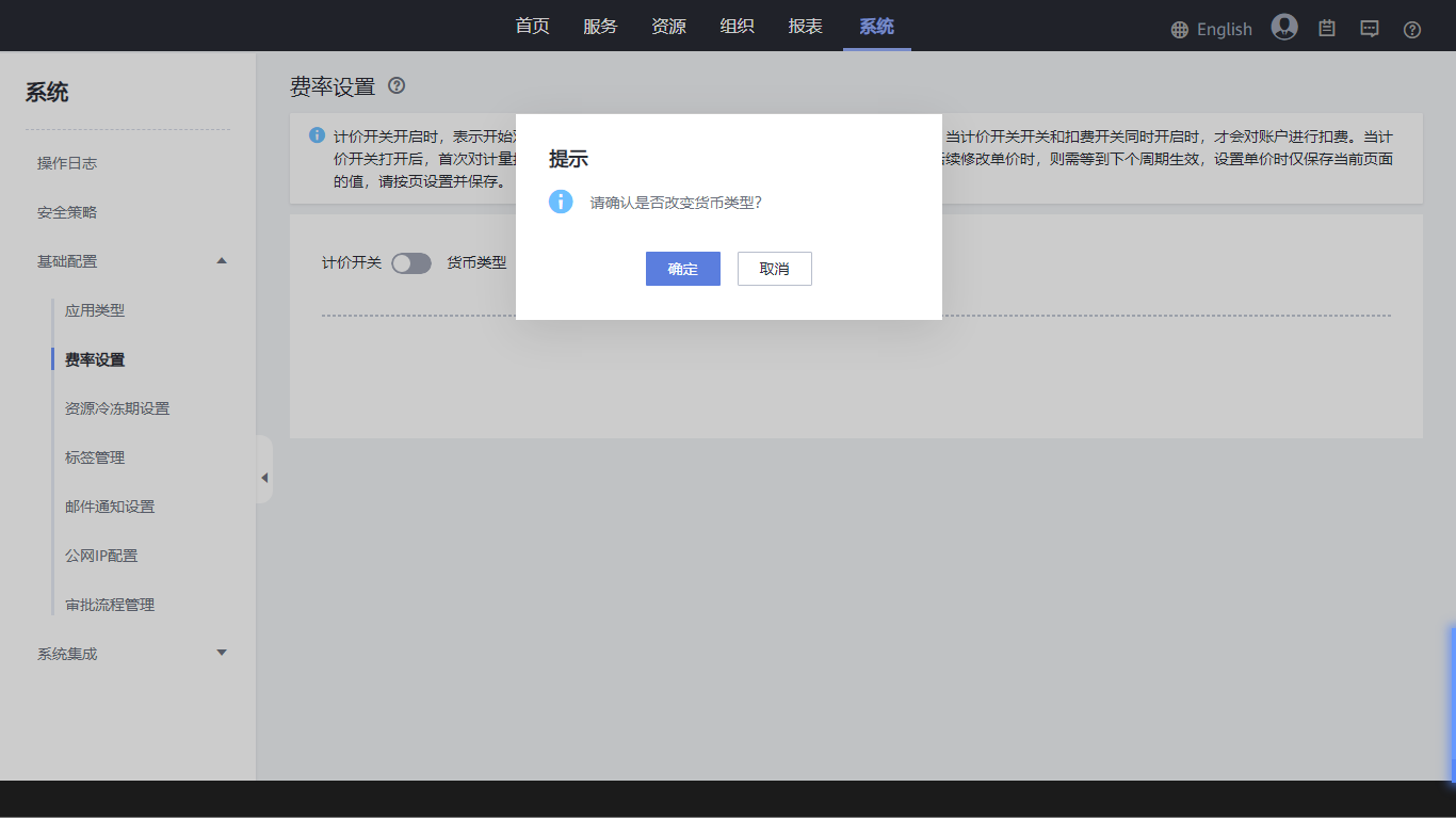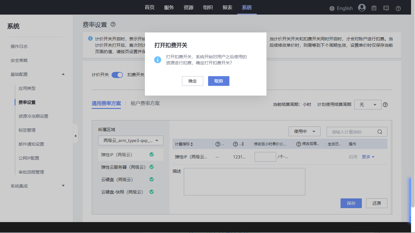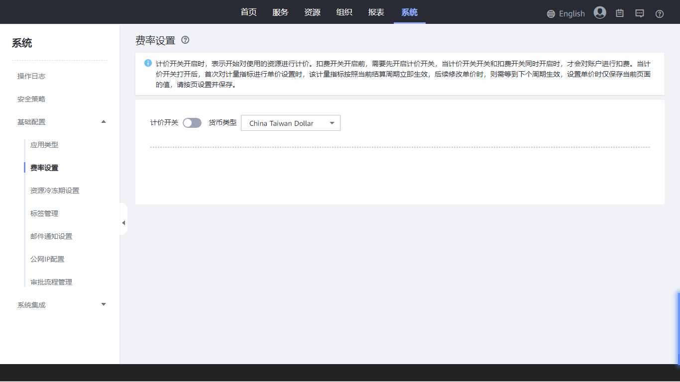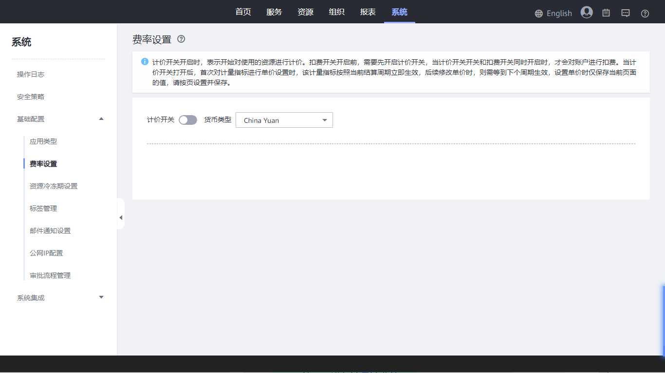 将货币类型设置为“China Yuan”,您也可以根据实际需要设置货币类型。打开计价和扣费开关。