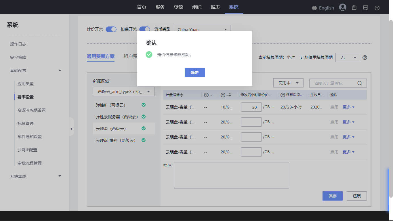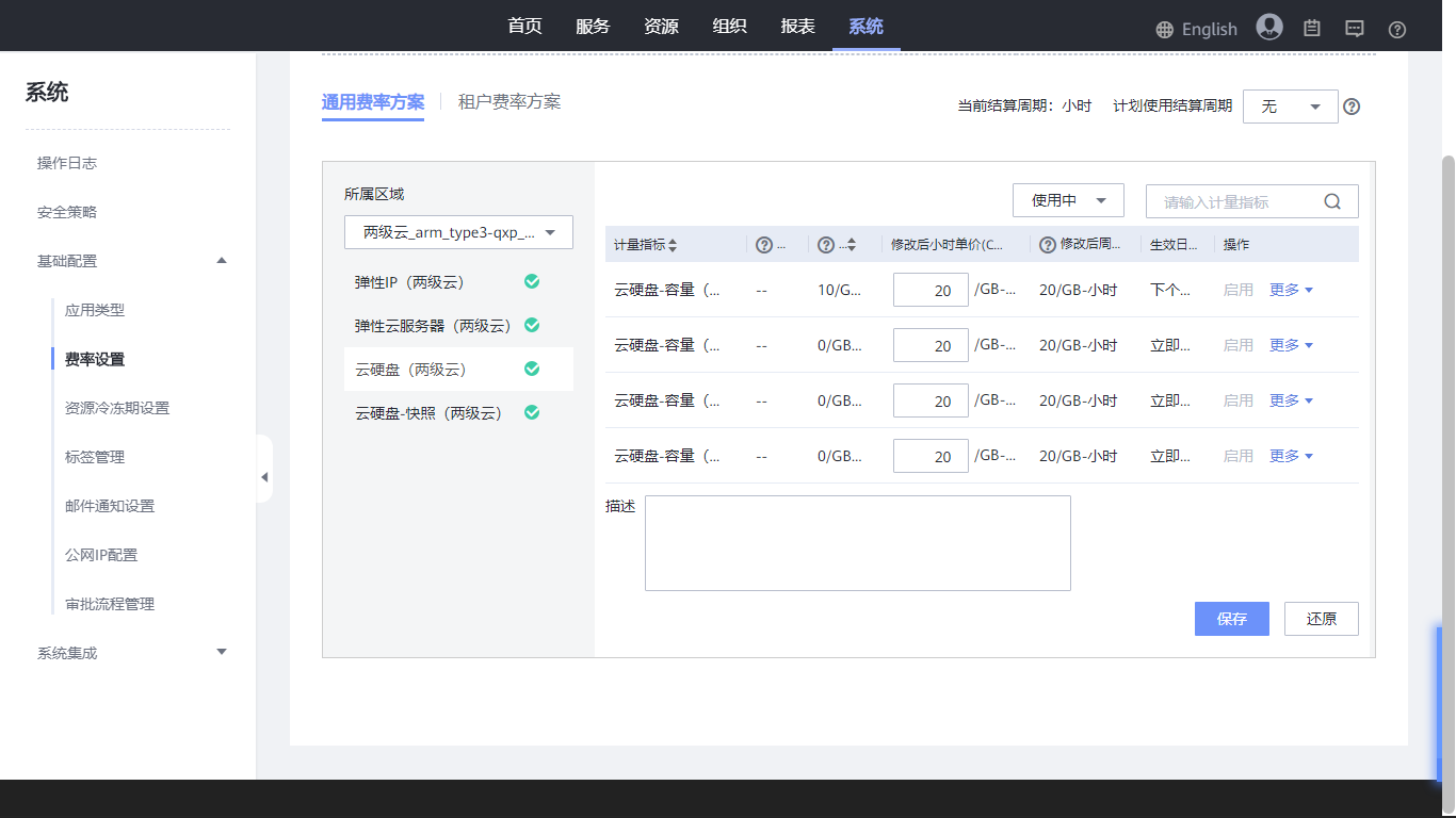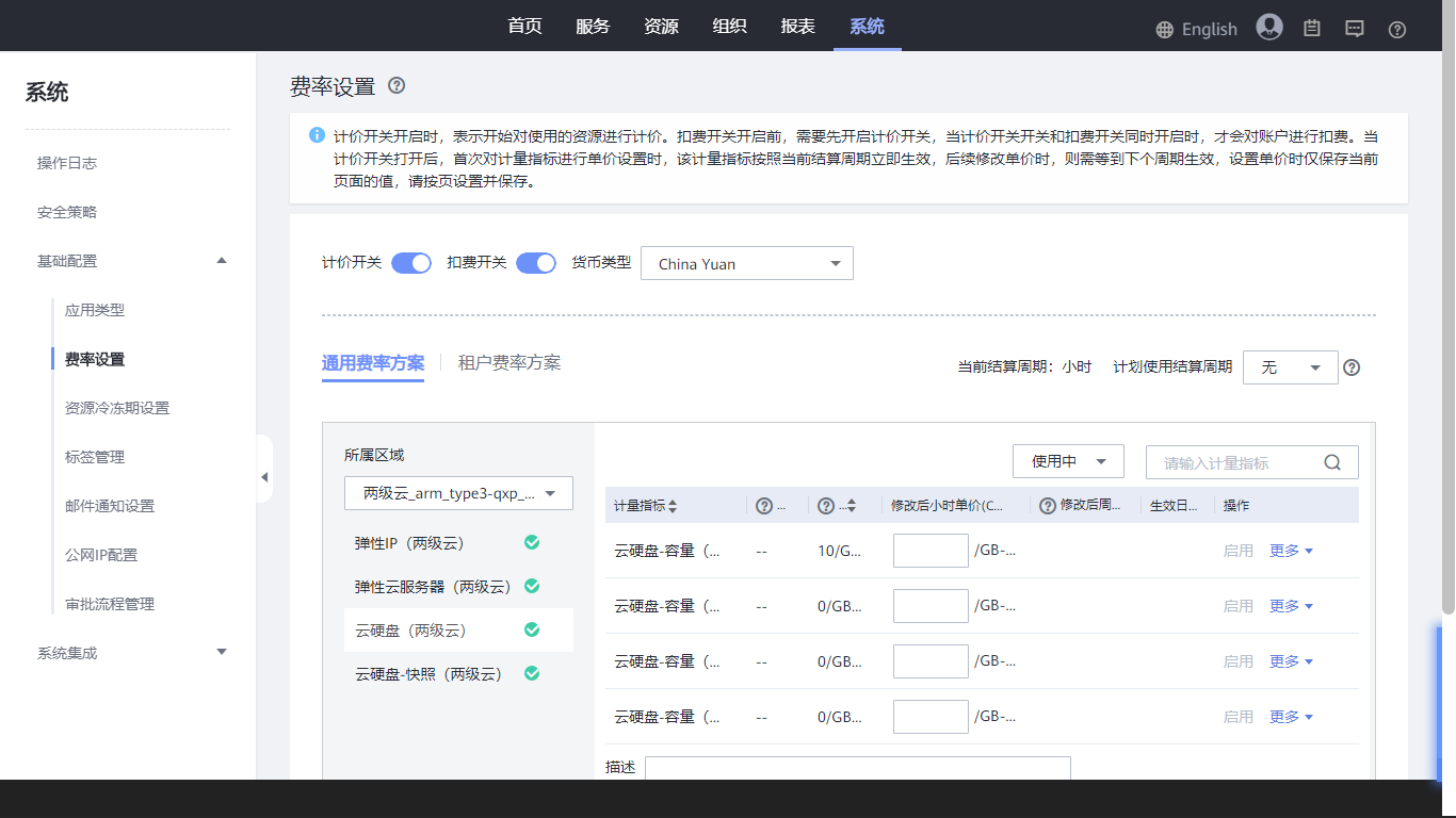 在计量指标所在行,设置计量指标的单价。此处以设置“云硬盘”计量指标单价为例。