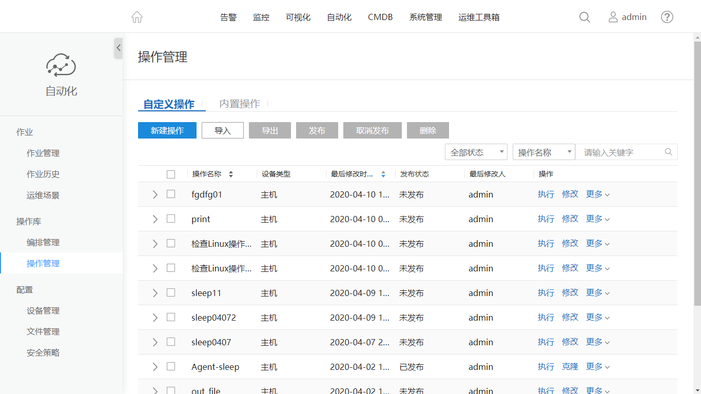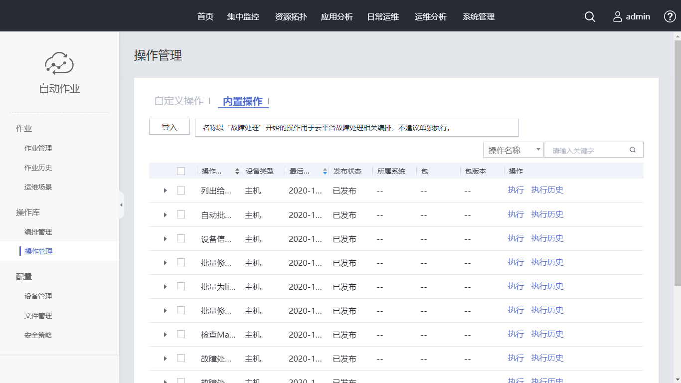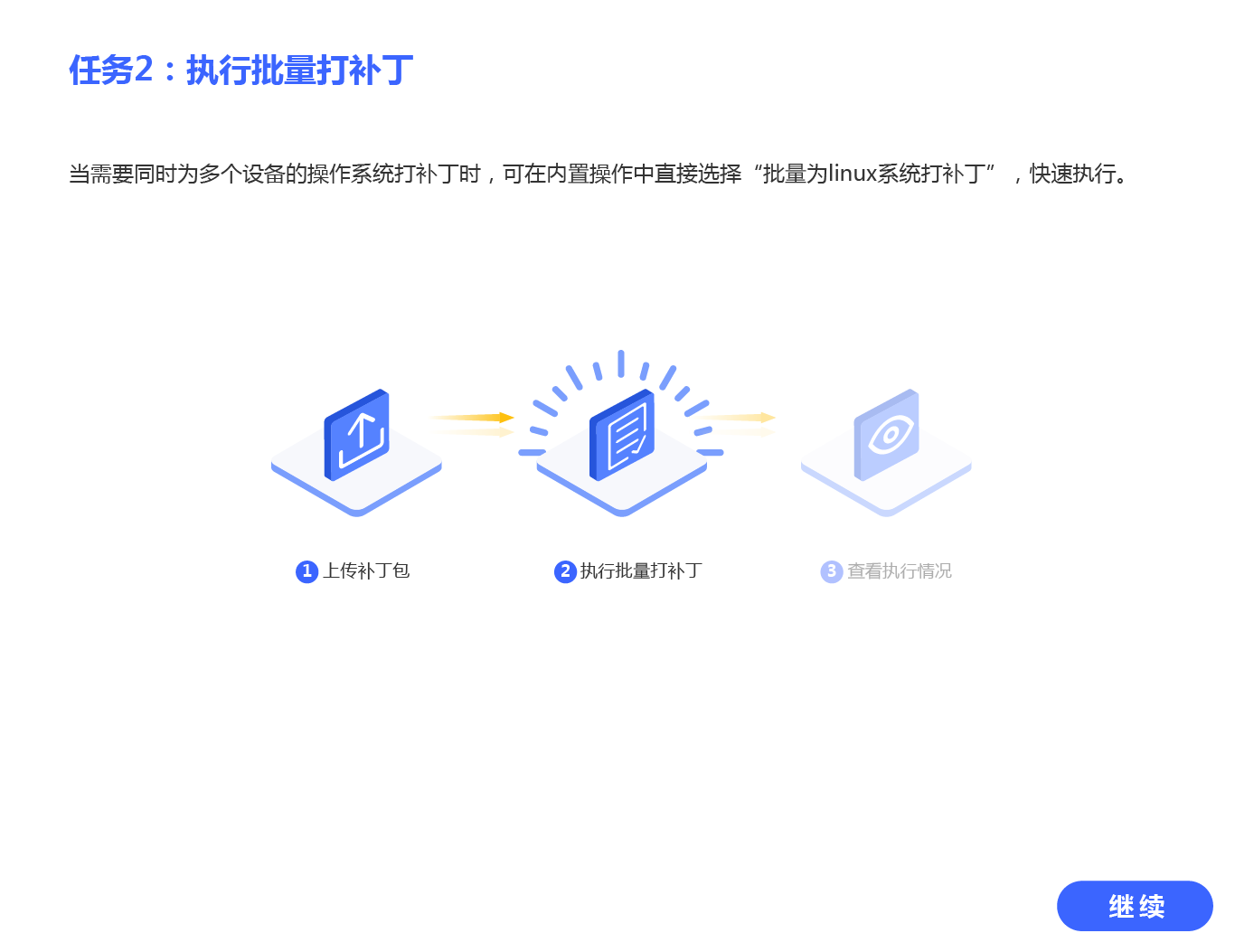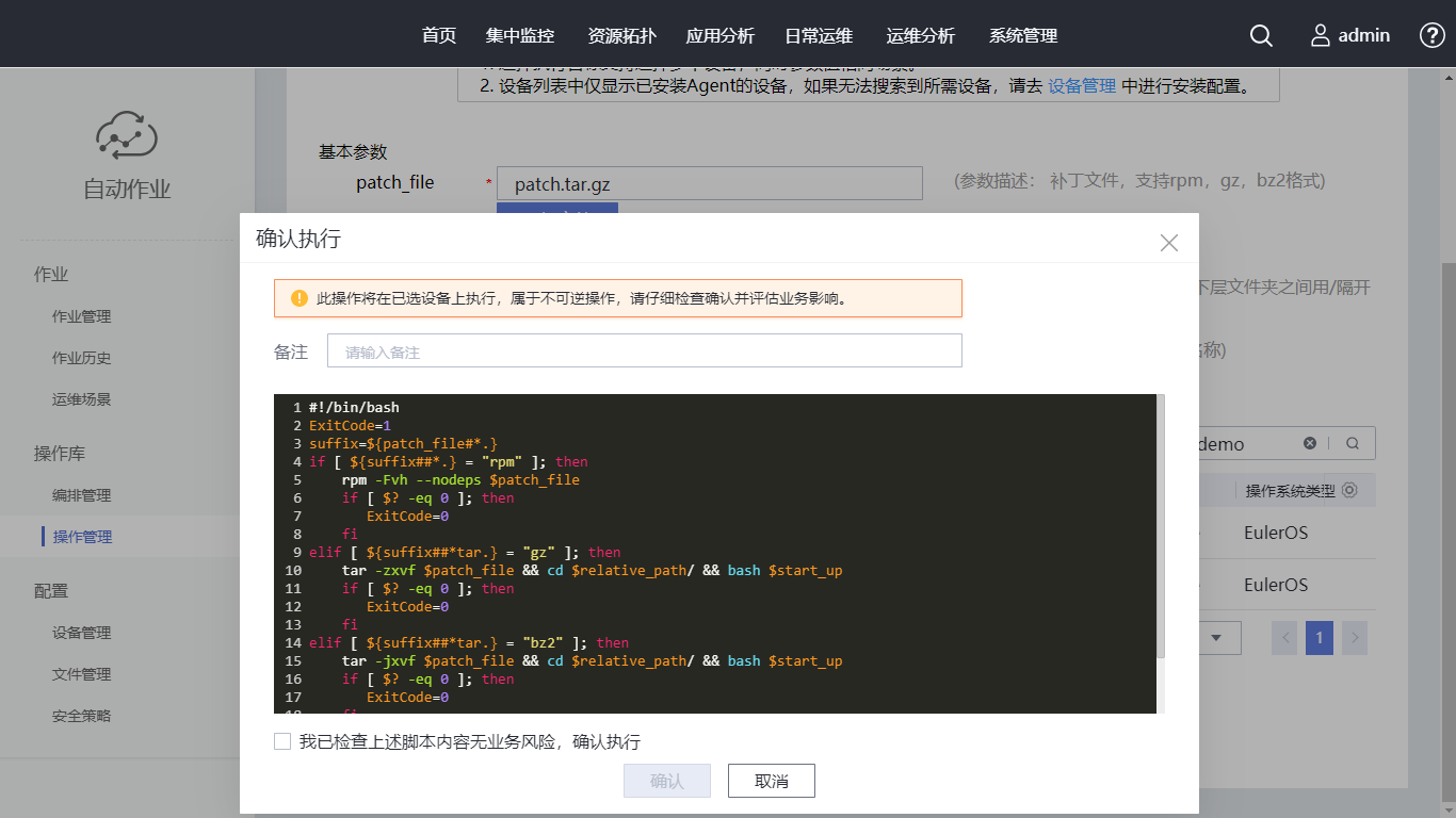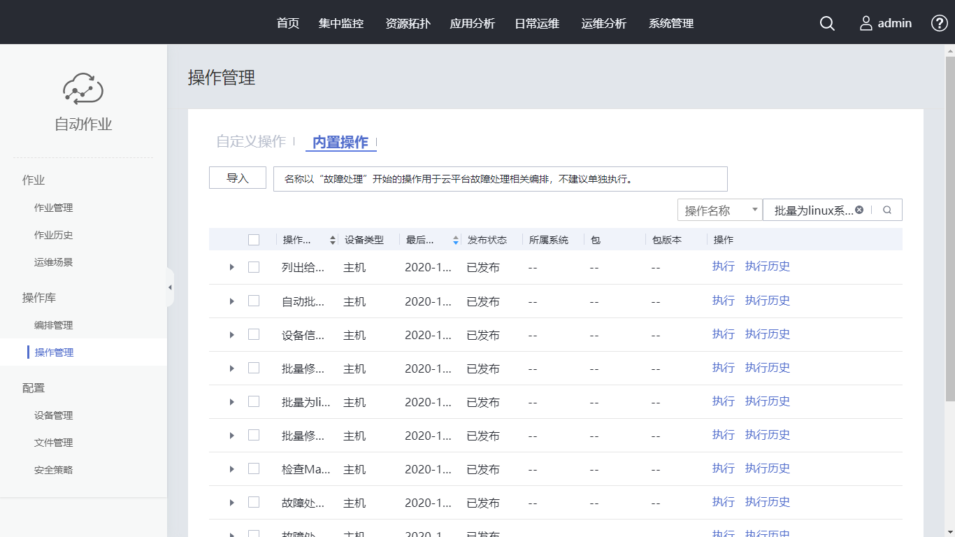 单击“内置操作”后,单击“批量为linux系统打补丁”操作所在行的 “执行”。