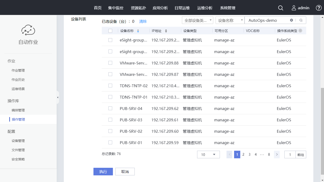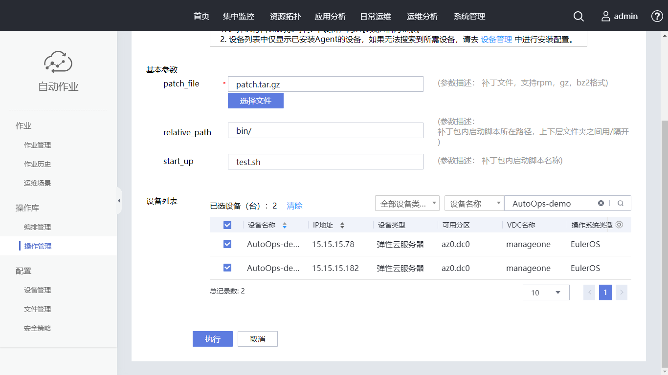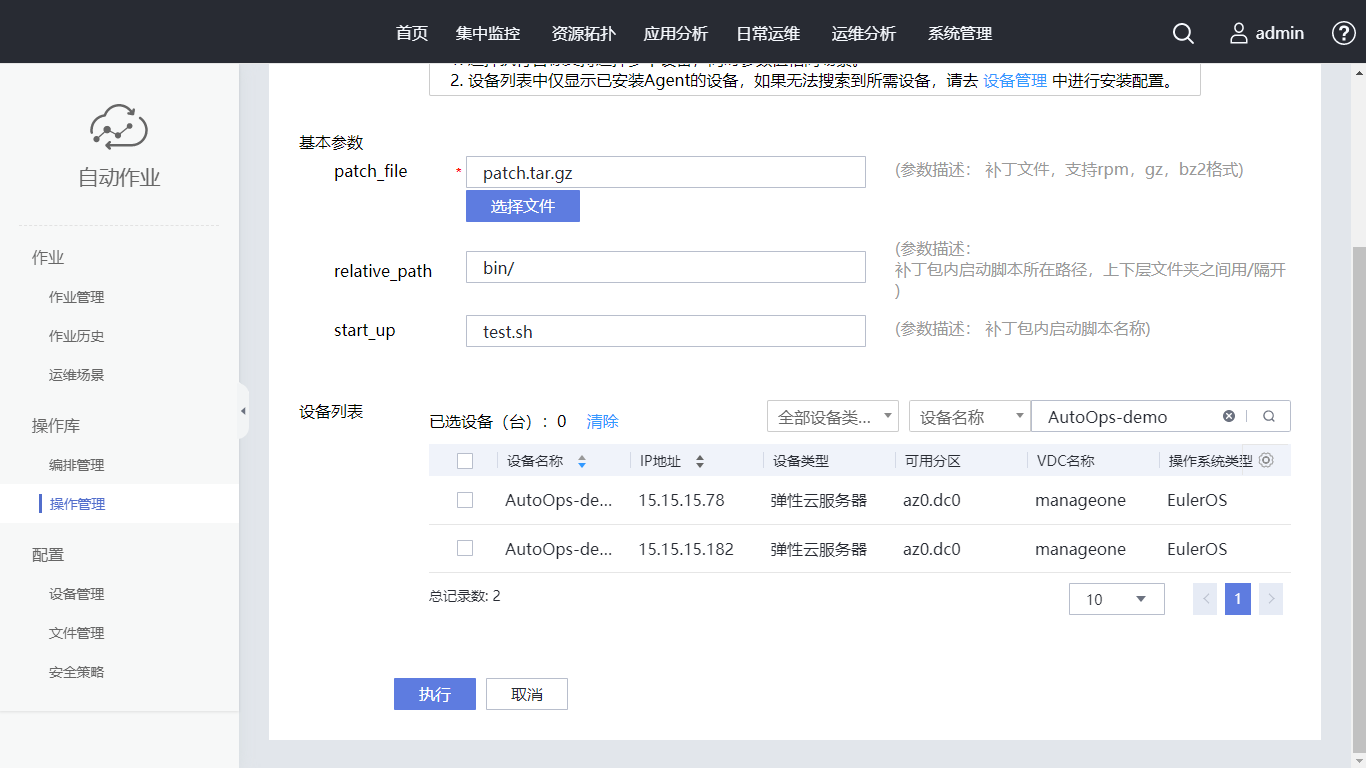 在设备列表的搜索框内输入“AutoOps-demo”,勾选“设备名称”,单击“执行”,核对执行脚本无误后单击“确认”。自动跳转至“作业历史”页面,可以查看到刚生成的一条作业。