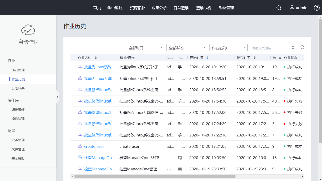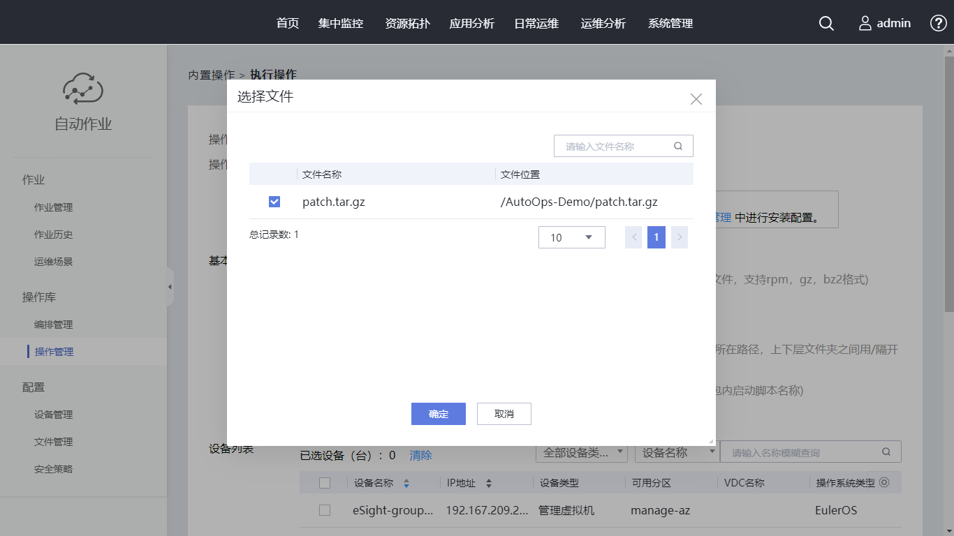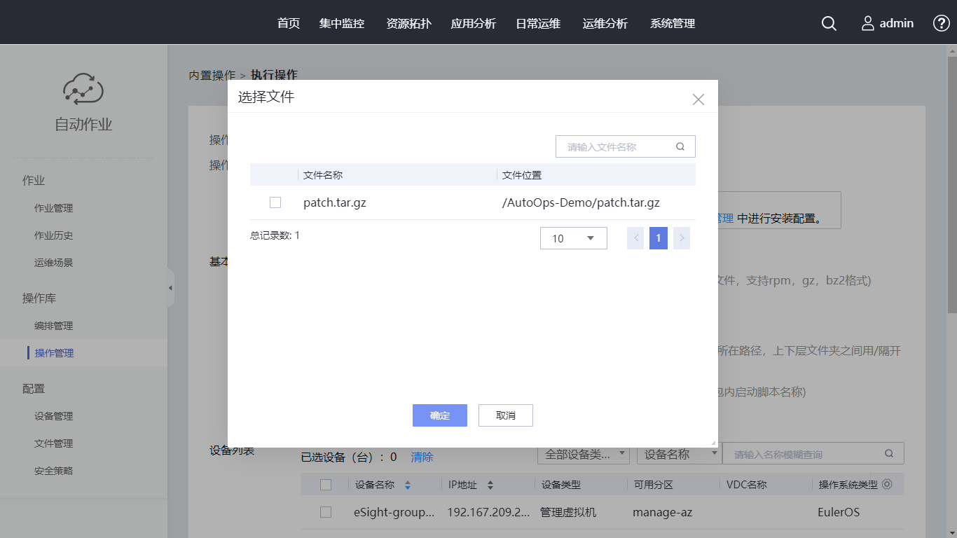 在设备列表的搜索框内输入“AutoOps-demo”,勾选“设备名称”,单击“执行”,核对执行脚本无误后单击“确认”。自动跳转至“作业历史”页面,可以查看到刚生成的一条作业。