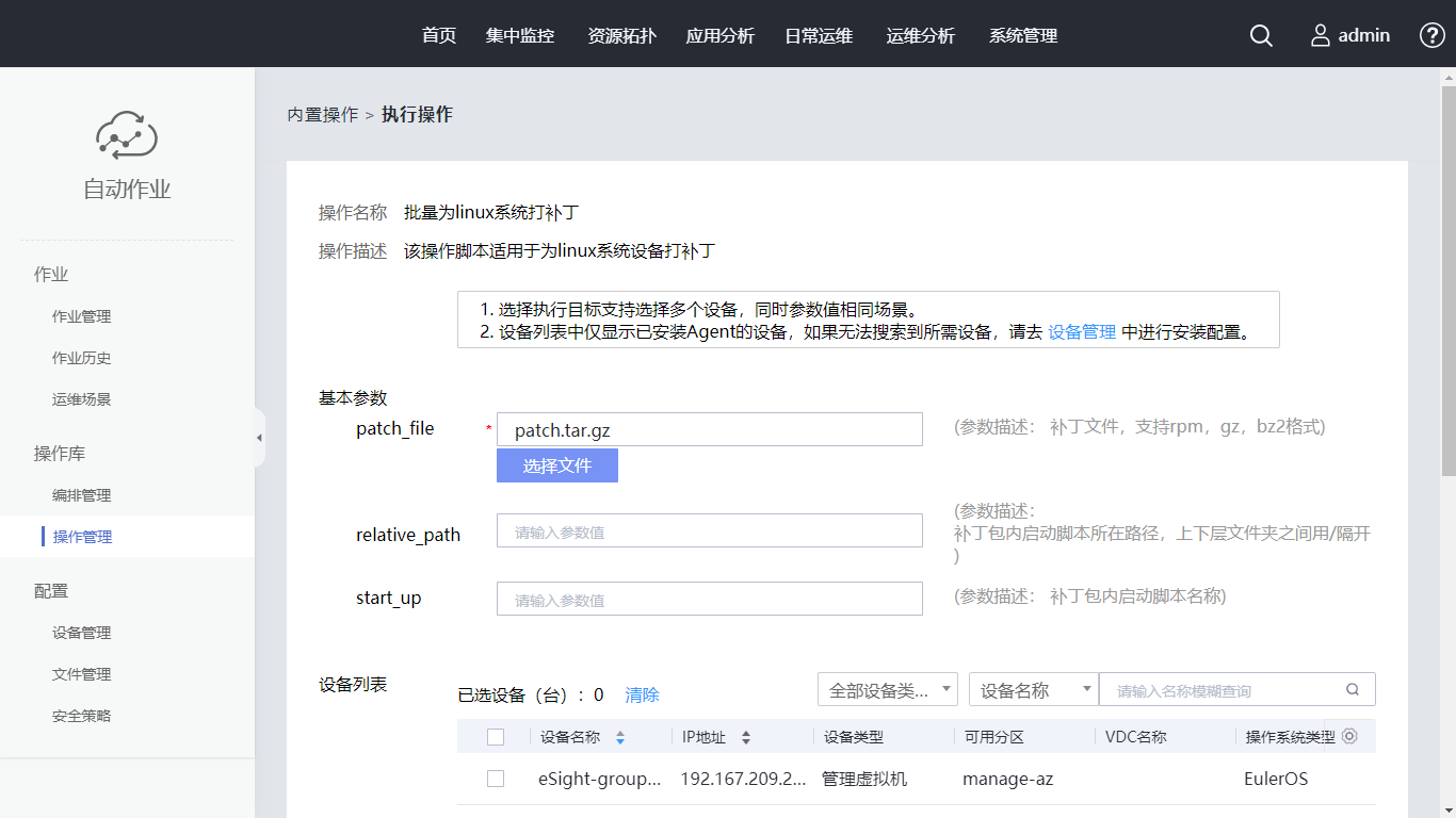 单击基本参数区域的“选择文件”,选择刚上传的补丁包。根据补丁包内启动脚本所在路径和名称,设置“relative_path” 为“bin/”,“start_up”为“test.sh”。