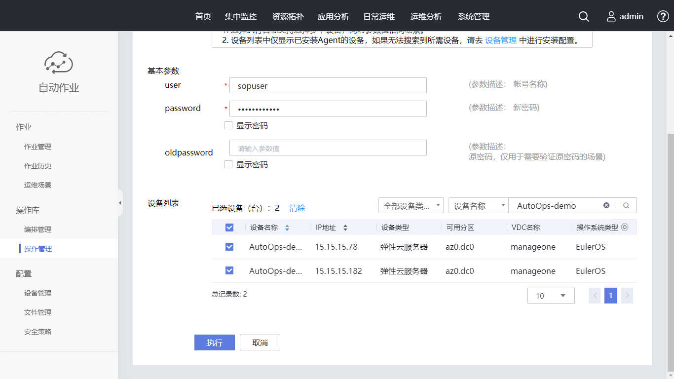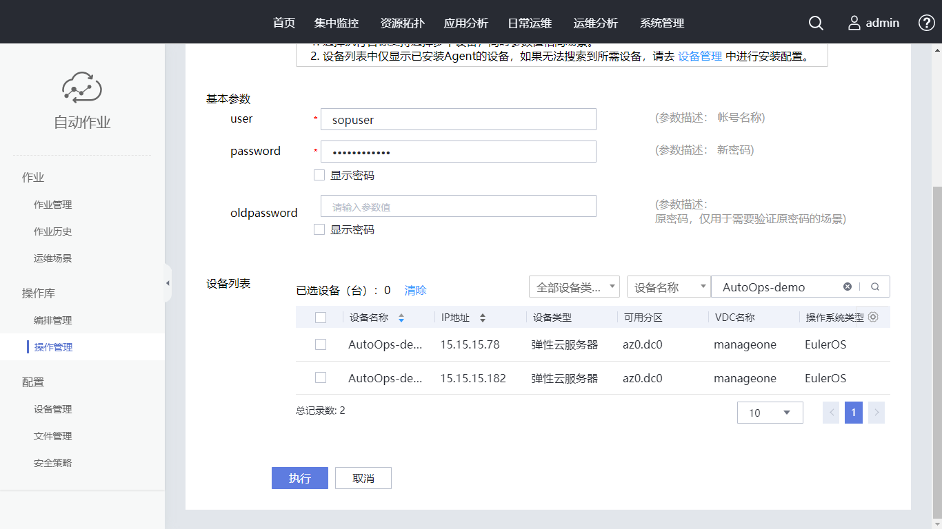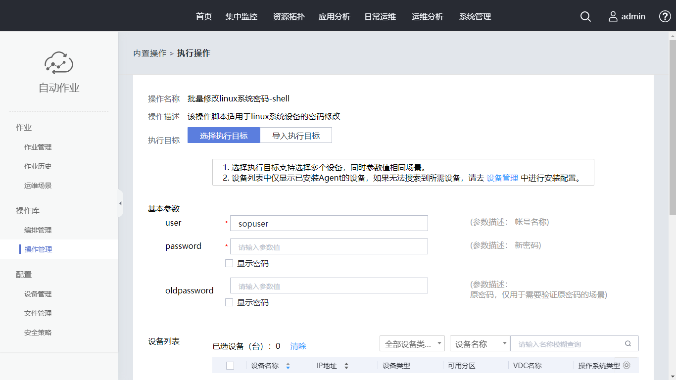 单击“选择执行目标”,在基本参数区域输入帐号名和新密码,本次操作“user”设置为“sopuser”,“password”设置为“Changeme_1234”, “oldpassword”为原密码,仅用于需要验证原密码的场景,此处默认不输入。