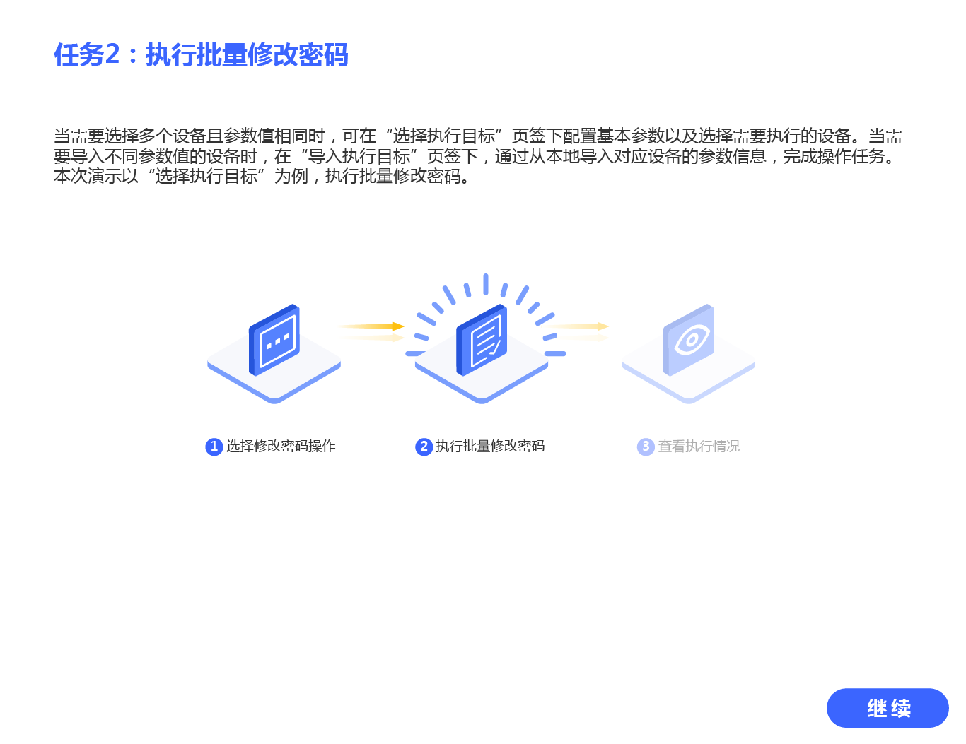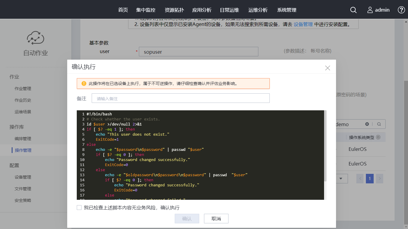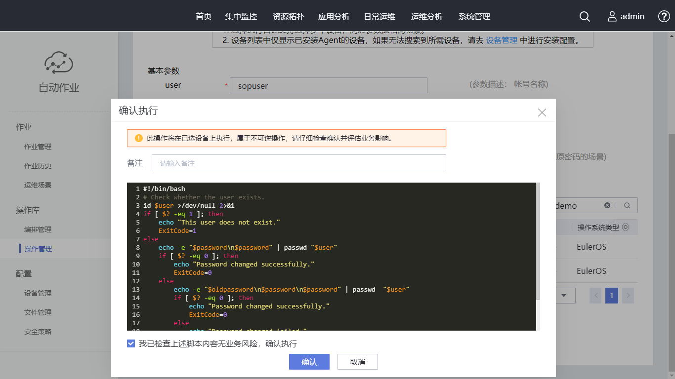 单击“选择执行目标”,在基本参数区域输入帐号名和新密码,本次操作“user”设置为“sopuser”,“password”设置为“Changeme_1234”, “oldpassword”为原密码,仅用于需要验证原密码的场景,此处默认不输入。
