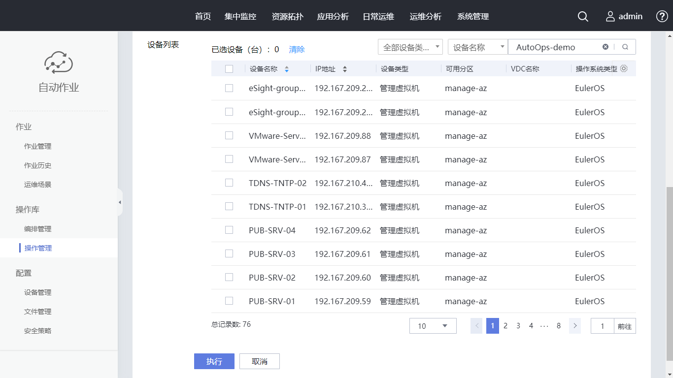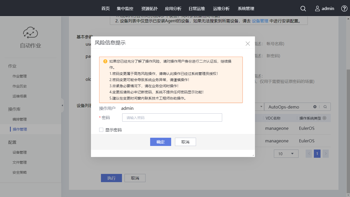 在设备列表的搜索框内输入“AutoOps-demo”,勾选“设备名称”,单击“执行”,输入操作用户密码后单击“确定”,核对执行脚本无误后单击“确认”。自动跳转至“作业历史”页面,可以查看到刚生成的一条作业。