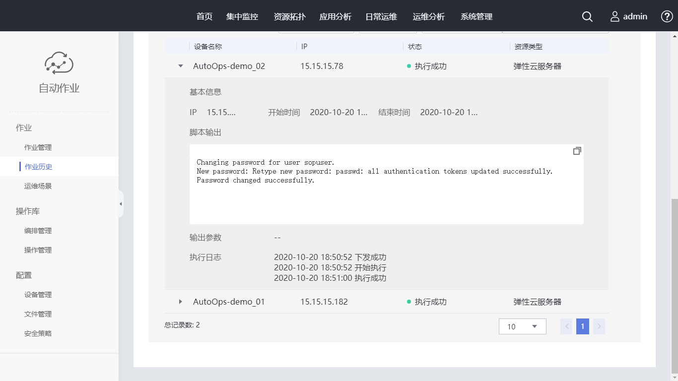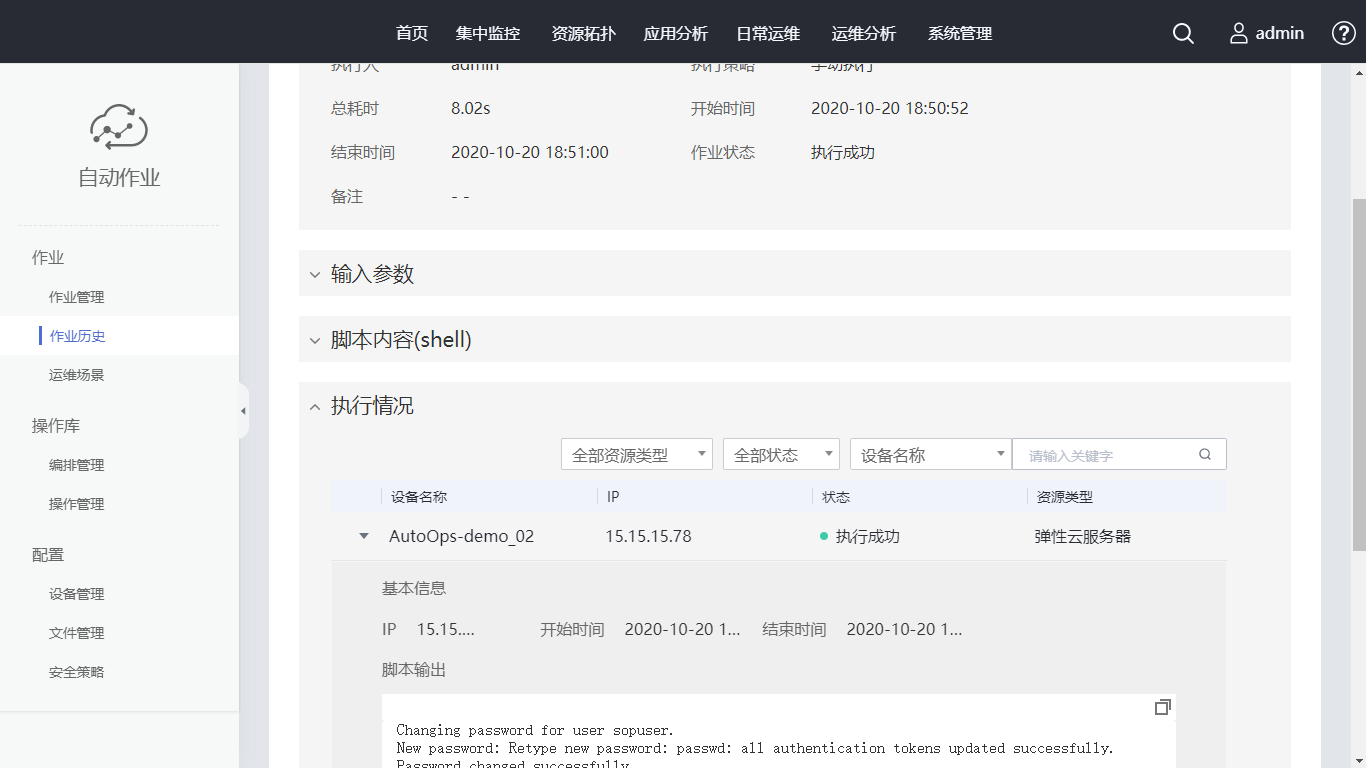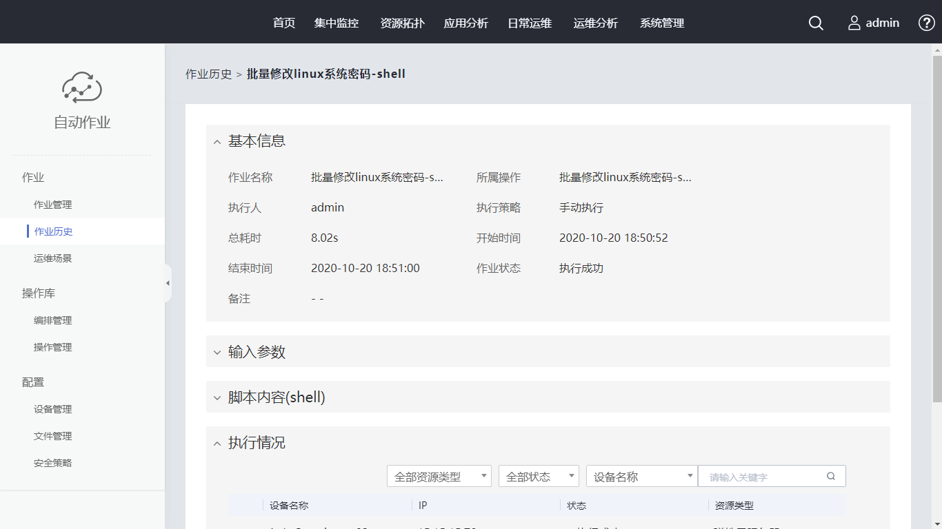 单击“作业历史”页面刚生成的作业名称链接,展开“执行情况”下面的设备名称,通过查看基本信息、脚本输出、输出参数、执行日志,了解批量修改密码的详细执行情况。