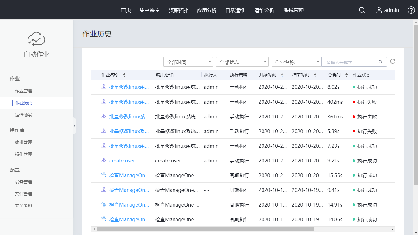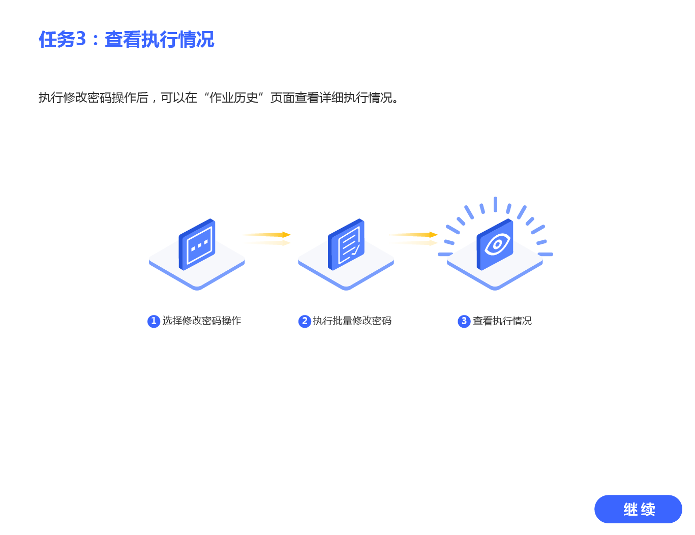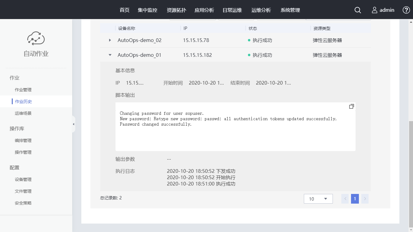 单击“作业历史”页面刚生成的作业名称链接,展开“执行情况”下面的设备名称,通过查看基本信息、脚本输出、输出参数、执行日志,了解批量修改密码的详细执行情况。
