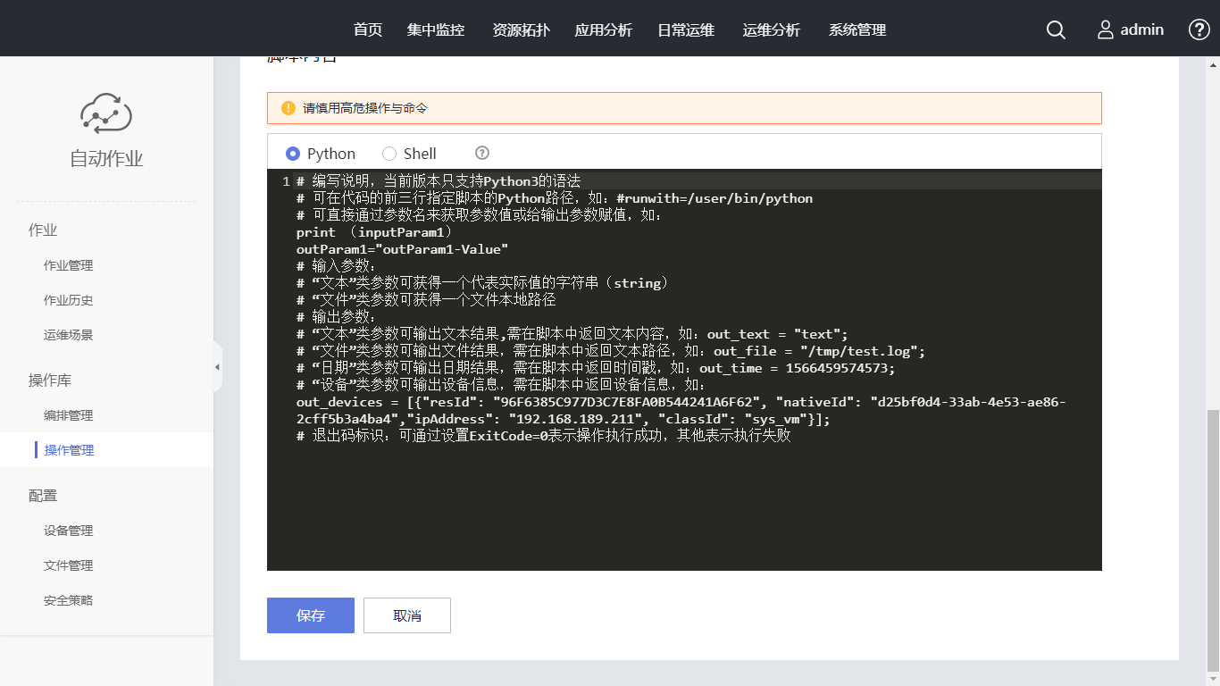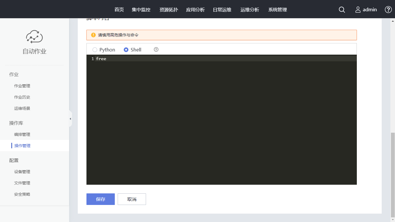 选择“Shell”,输入“free”,单击页面下方的“保存”。脚本设置完成后,可以在操作管理主界面查看到新建的巡检操作。