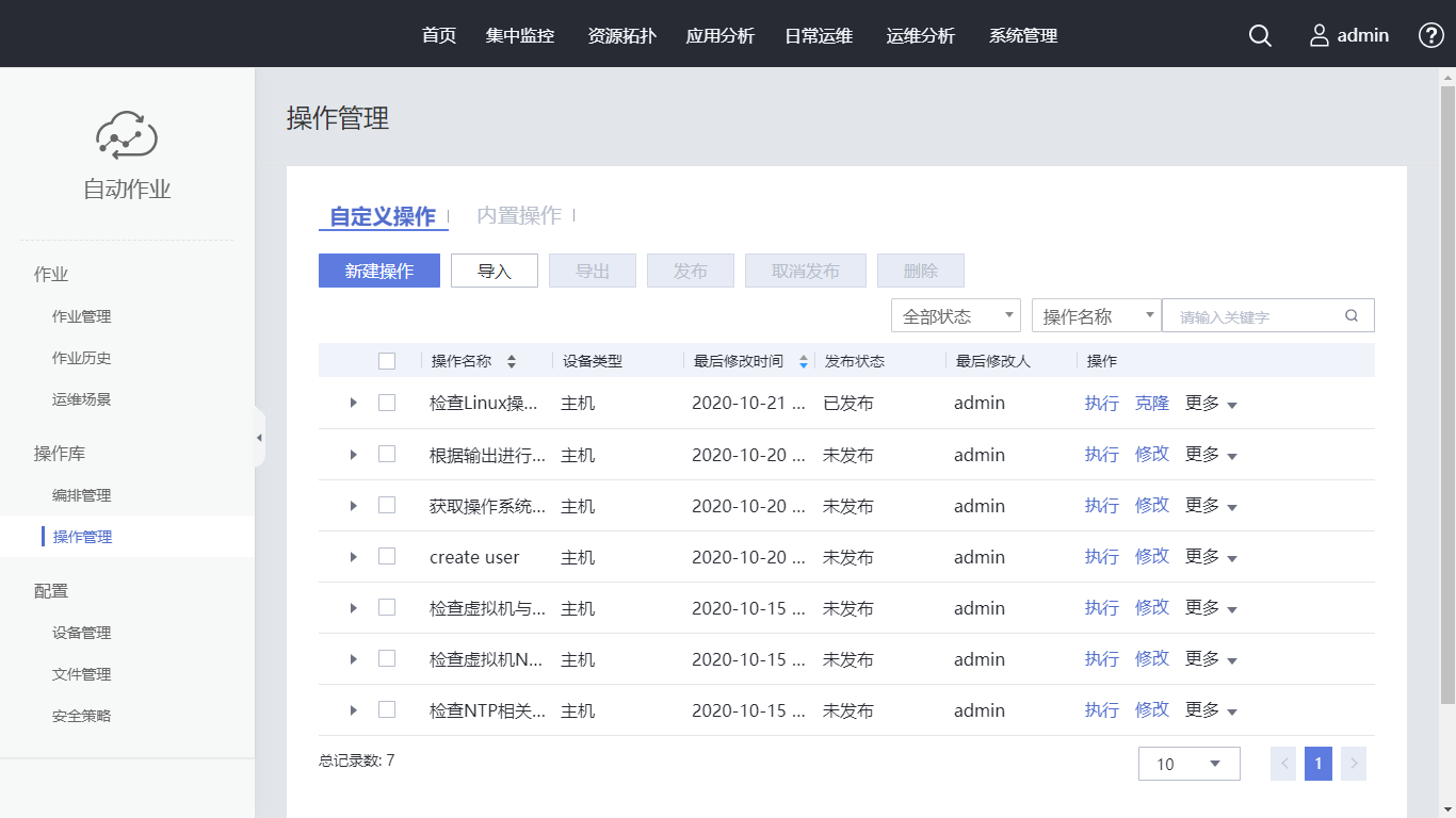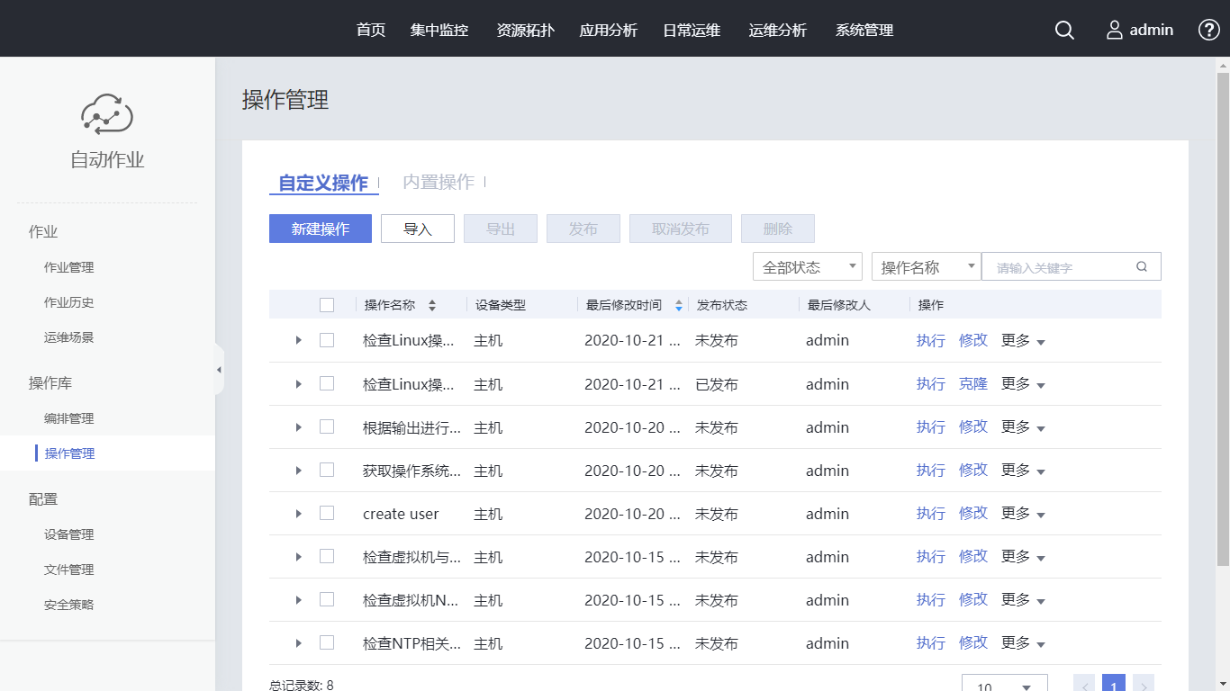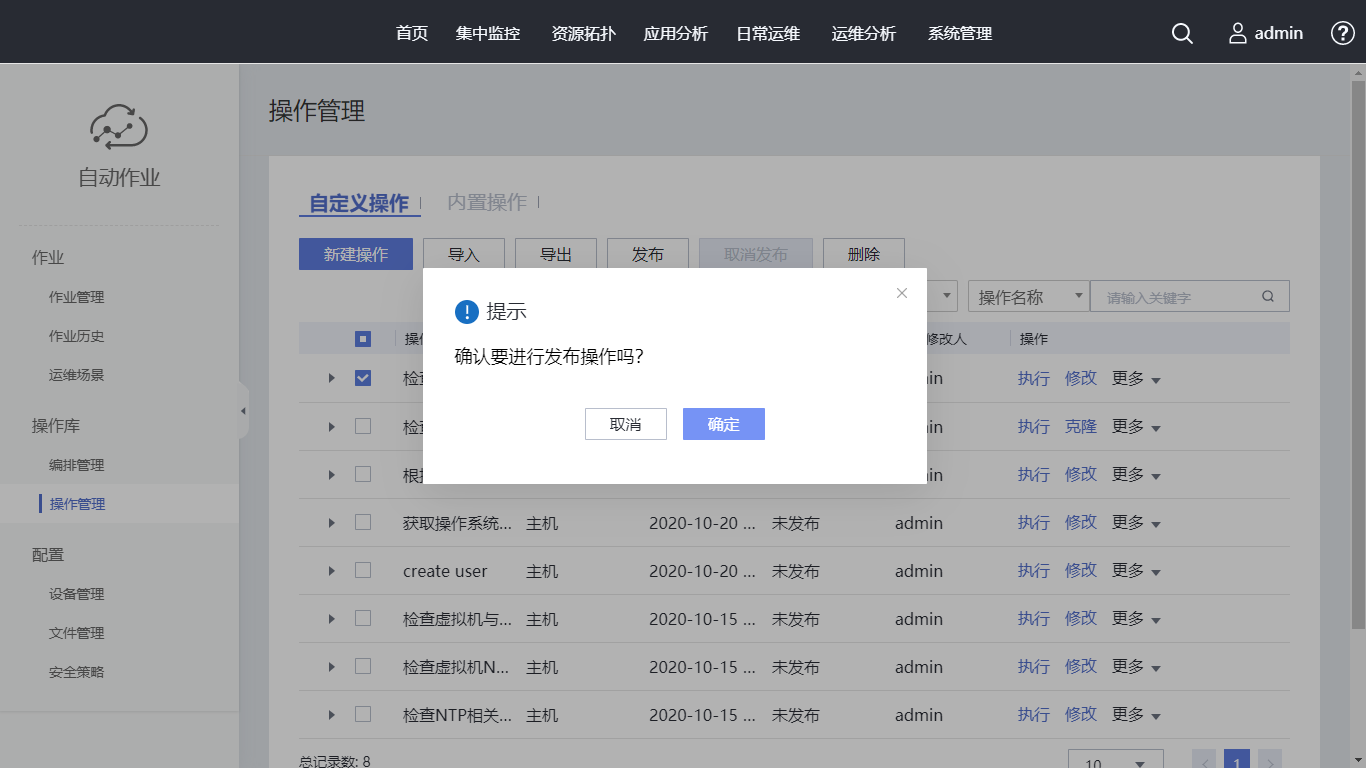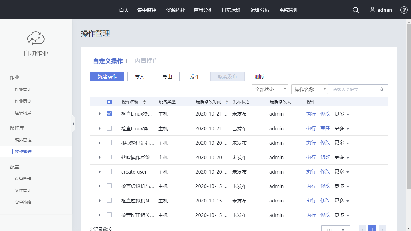 在操作管理主界面,勾选新建的操作,单击“发布”。待发布状态列为“已发布”,表示发布成功。