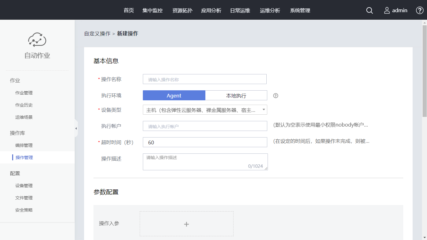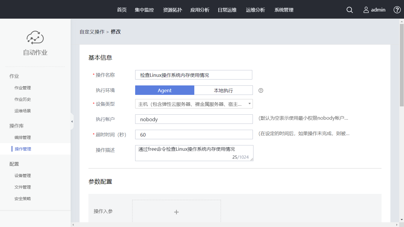 单击“新建操作”,操作名称设置为“检查Linux操作系统内存使用情况”、操作描述为“通过free命令检查Linux操作系统内存使用情况”,其他参数使用默认值。