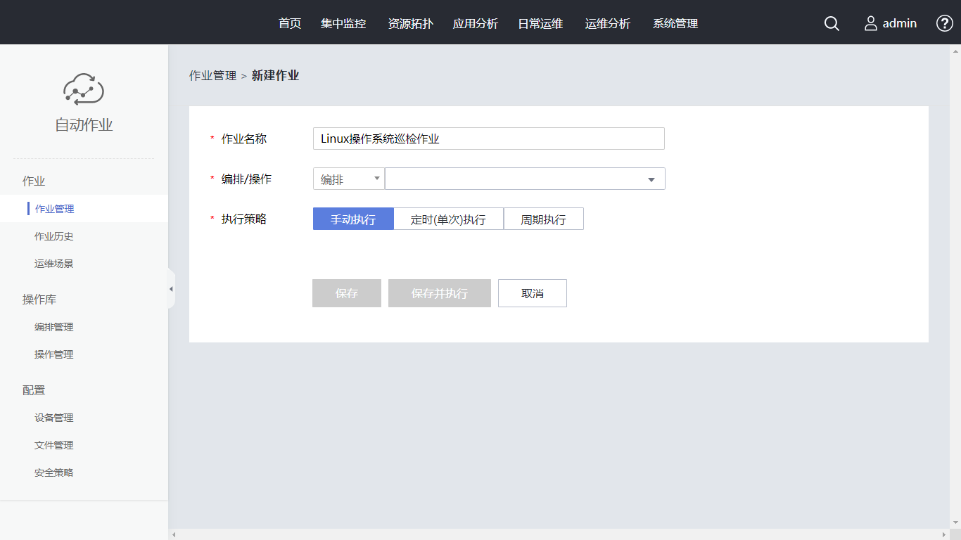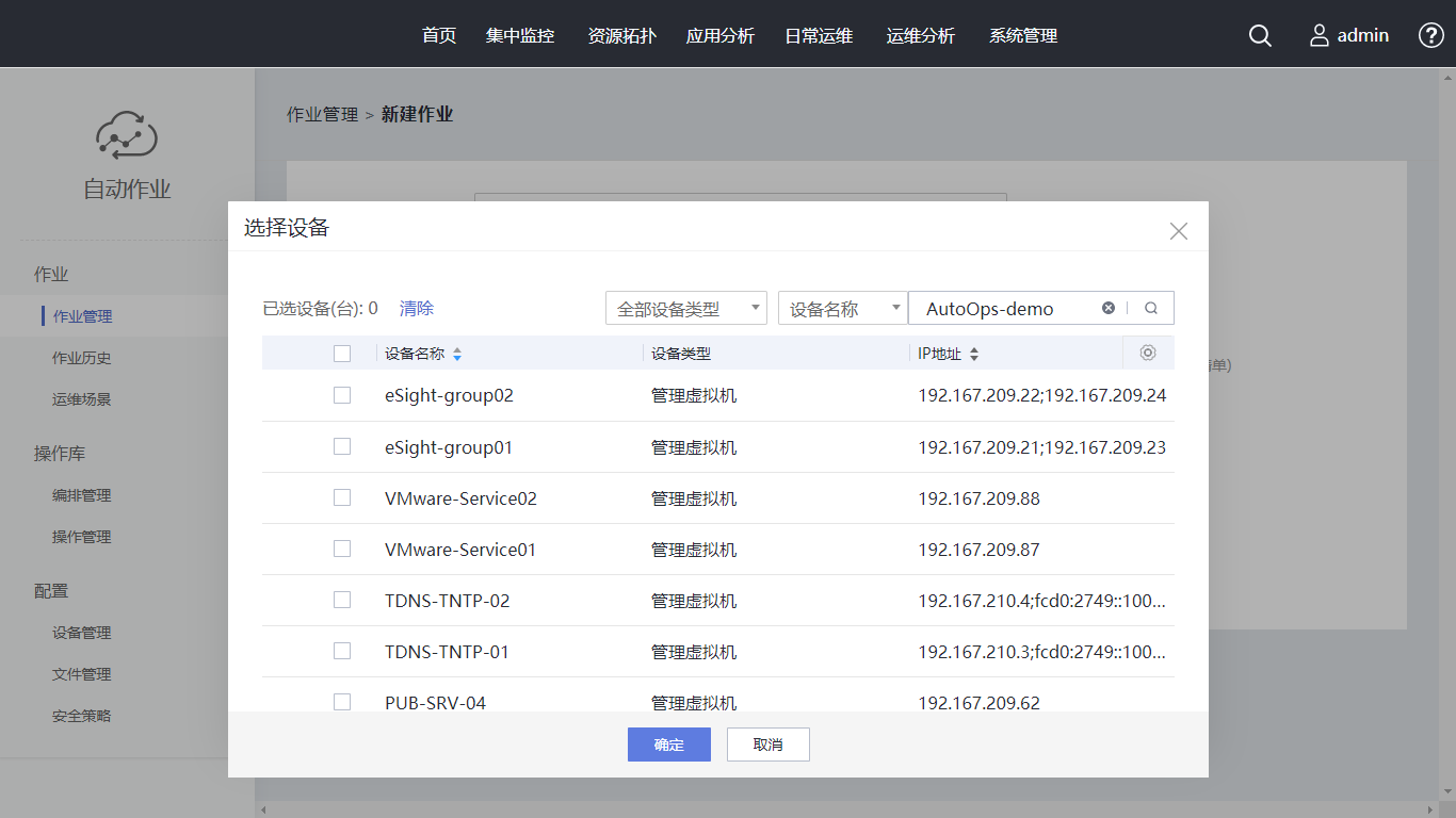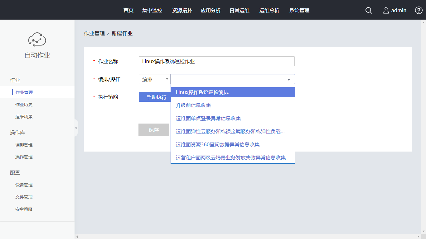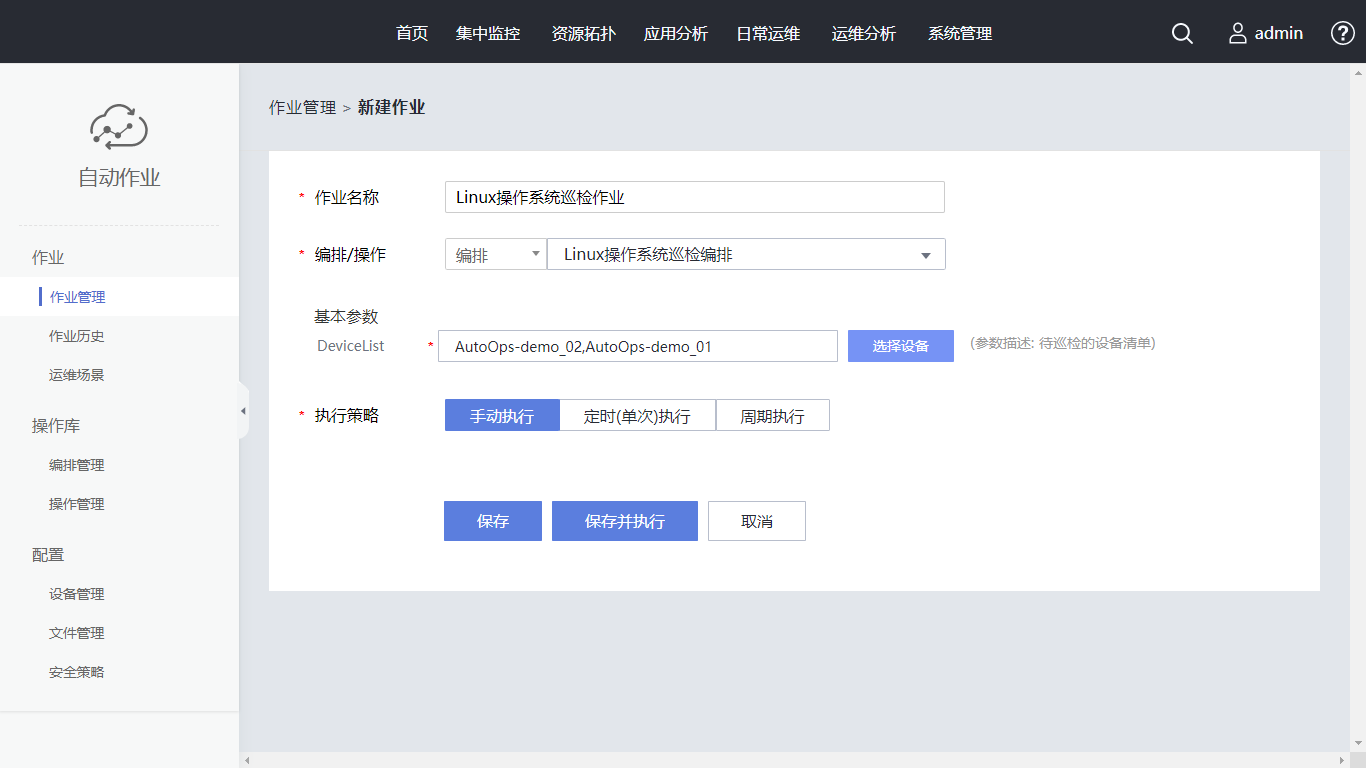 单击“新建作业”,作业名称设置为“Linux操作系统巡检作业”。在编排/操作中选择已创建的编排。单击“选择设备”,在搜索框内输入“AutoOps-demo”,勾选对应设备,单击“确定”。执行策略使用“手动执行”, 同时支持定时(单次)执行、周期执行。