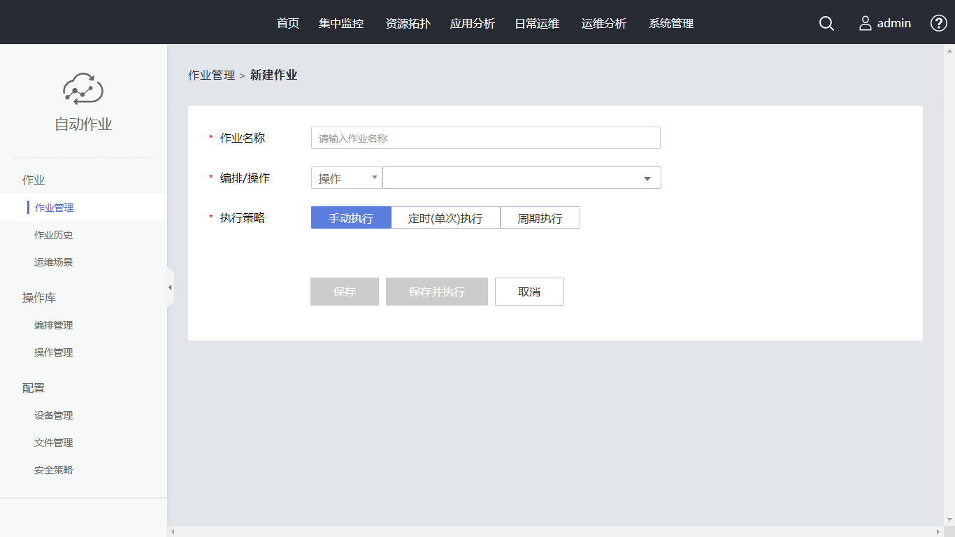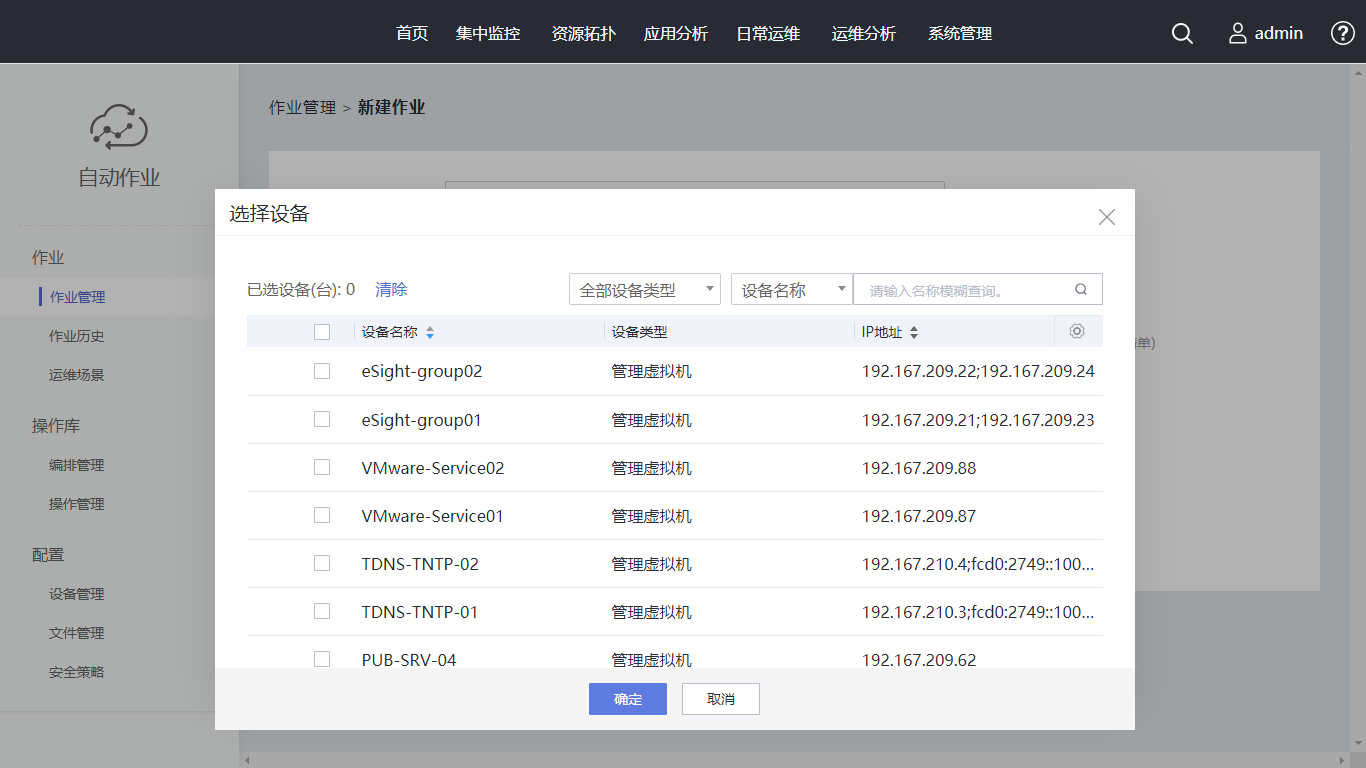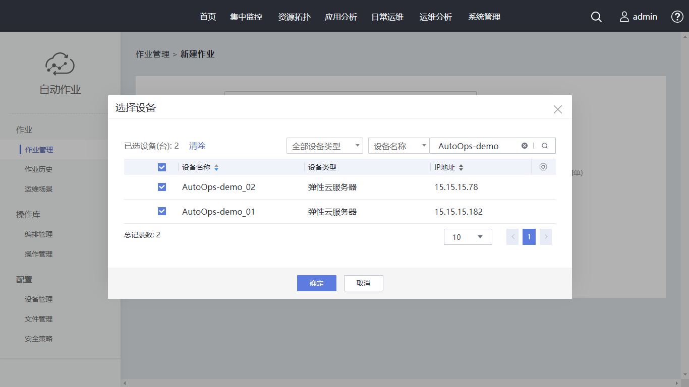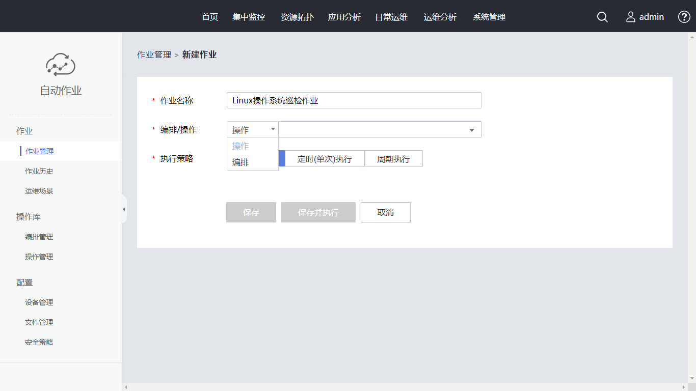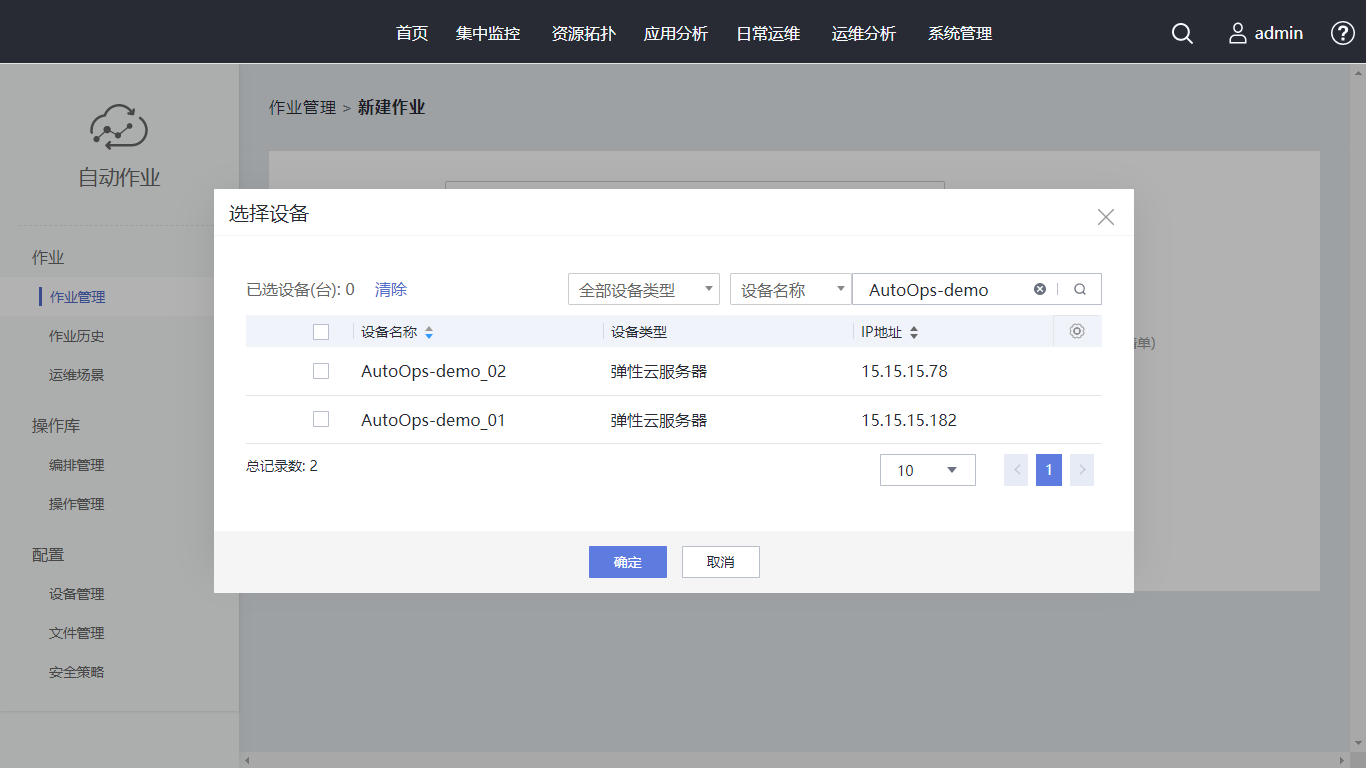 单击“新建作业”,作业名称设置为“Linux操作系统巡检作业”。在编排/操作中选择已创建的编排。单击“选择设备”,在搜索框内输入“AutoOps-demo”,勾选对应设备,单击“确定”。执行策略使用“手动执行”, 同时支持定时(单次)执行、周期执行。