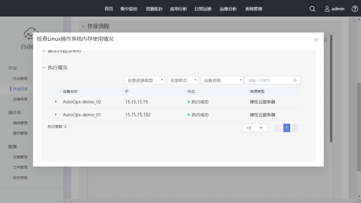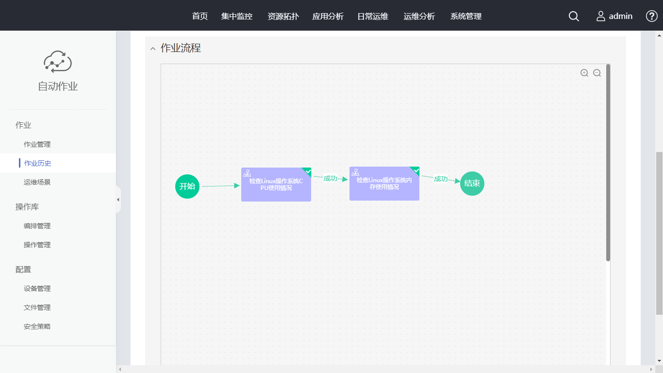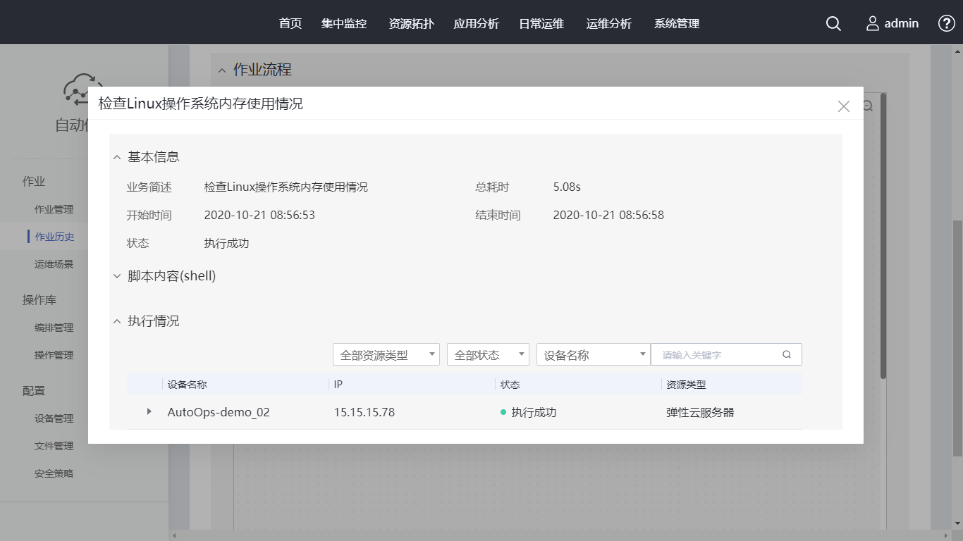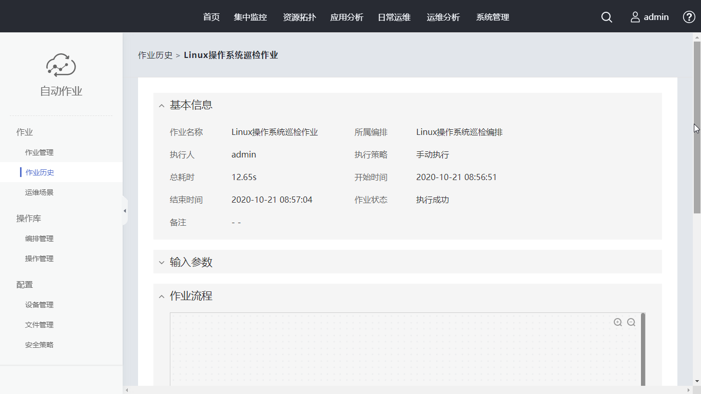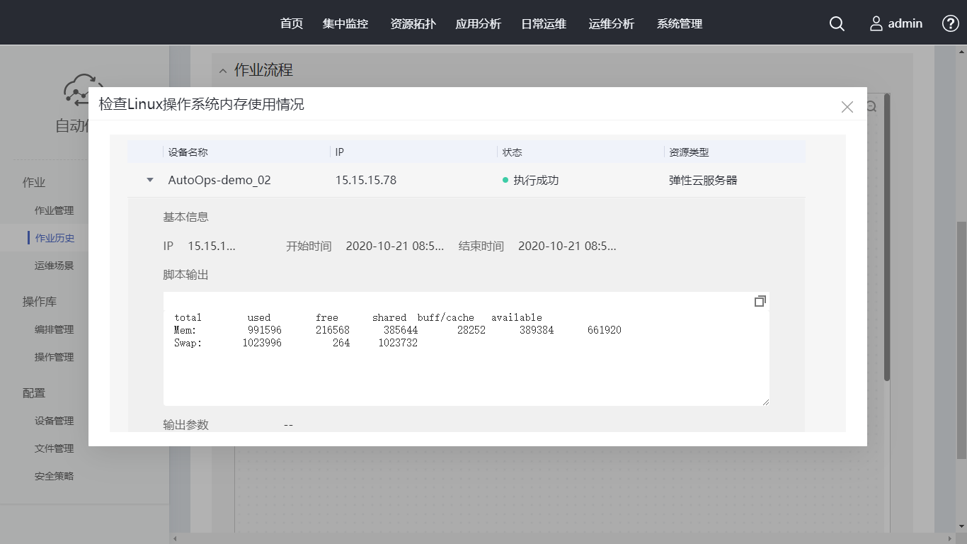 单击“作业历史”中刚创建的作业名称,选择“作业流程”中的“检查Linux操作系统内存使用情况”,进入执行情况查看界面。